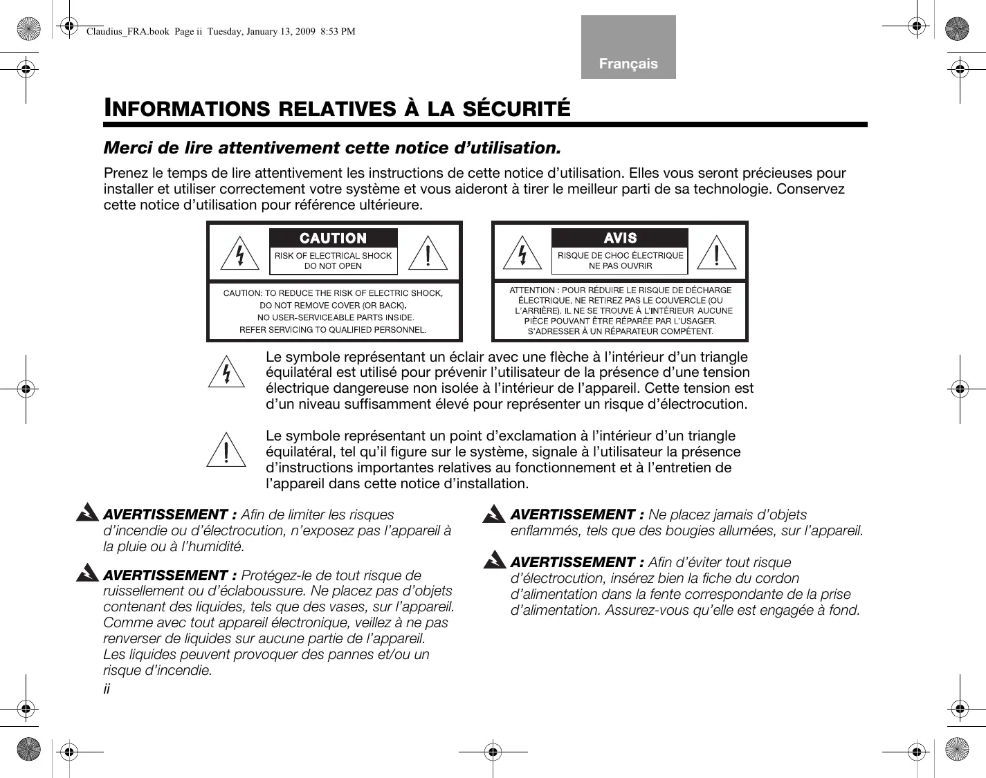 Merci de lire attentivement cette notice d’utilisation. Prenez le temps de lire attentivement les instructions de cette notice d’utilisation. Elles vous seront précieuses pour installer et utiliser correctement votre système et vous aideront à tirer le meilleur parti de sa technologie. Conservez cette notice d’utilisation pour référence ultérieure. Le symbole représentant un éclair avec une flèche à l’intérieur d’un triangle équilatéral est utilisé pour prévenir l’utilisateur de la présence d’une tension électrique dangereuse non isolée à l’intérieur de l’appareil. Cette tension est d’un niveau suffisamment élevé pour représenter un risque d’électrocution. Le symbole représentant un point d’exclamation à l’intérieur d’un triangle équilatéral, tel qu’il figure sur le système, signale à l’utilisateur la présence d’instructions importantes relatives au fonctionnement et à l’entretien de l’appareil dans cette notice d’installation.