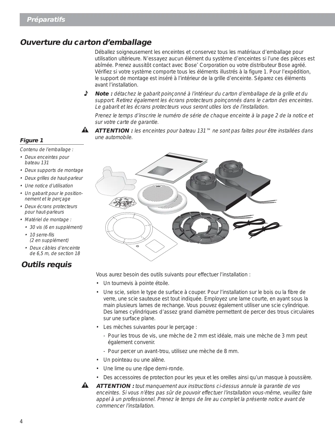 Note : détachez le gabarit poinçonné à l’intérieur du carton d’emballage de la grille et du support. Retirez également les écrans protecteurs poinçonnés dans le carton des enceintes. Le gabarit et les écrans protecteurs vous seront utiles lors de l’installation. Prenez le temps d’inscrire le numéro de série de chaque enceinte à la page 2 de la notice et sur votre carte de garantie. Figure 1 ATTENTION : les enceintes pour bateau 131™ ne sont pas faites pour être installées dans une automobile. Contenu de l’emballage :