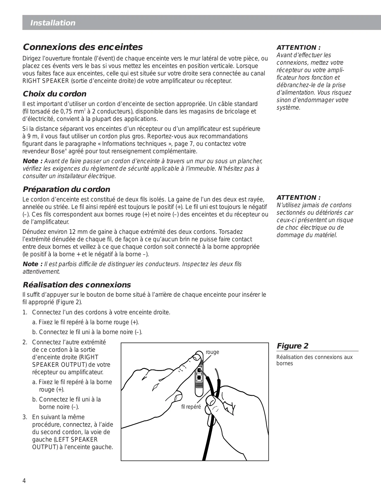 Installation Connexions des enceintes Dirigez l’ouverture frontale (l’évent) de chaque enceinte vers le mur latéral de votre pièce, ou placez ces évents vers le bas si vous mettez les enceintes en position verticale. Lorsque vous faites face aux enceintes, celle qui est située sur votre droite sera connectée au canal RIGHT SPEAKER (sortie d’enceinte droite) de votre amplificateur ou récepteur. Choix du cordon Il est important d’utiliser un cordon d’enceinte de section appropriée. Un câble standard (fil torsadé de 0,75 mm2 à 2 conducteurs), disponible dans les magasins de bricolage et d’électricité, convient à la plupart des applications. ATTENTION : Avant d’effectuer les connexions, mettez votre récepteur ou votre amplificateur hors fonction et débranchez-le de la prise d’alimentation. Vous risquez sinon d’endommager votre système. Si la distance séparant vos enceintes d’un récepteur ou d’un amplificateur est supérieure à 9 m, il vous faut utiliser un cordon plus gros. Reportez-vous aux recommandations figurant dans le paragraphe « Informations techniques », page 7, ou contactez votre revendeur Bose® agréé pour tout renseignement complémentaire. Note : Avant de faire passer un cordon d’enceinte à travers un mur ou sous un plancher, vérifiez les exigences du règlement de sécurité applicable à l’immeuble. N’hésitez pas à consulter un installateur électrique. Préparation du cordon Le cordon d’enceinte est constitué de deux fils isolés. La gaine de l’un des deux est rayée, annelée ou striée. Le fil ainsi repéré est toujours le positif (+). Le fil uni est toujours le négatif (–). Ces fils correspondent aux bornes rouge (+) et noire (–) des enceintes et du récepteur ou de l’amplificateur. Dénudez environ 12 mm de gaine à chaque extrémité des deux cordons. Torsadez l’extrémité dénudée de chaque fil, de façon à ce qu’aucun brin ne puisse faire contact entre deux bornes et veillez à ce que chaque cordon soit connecté à la borne appropriée (le positif à la borne + et le négatif à la borne –). ATTENTION : N’utilisez jamais de cordons sectionnés ou détériorés car ceux-ci présentent un risque de choc électrique ou de dommage du matériel. Note : Il est parfois difficile de distinguer les conducteurs. Inspectez les deux fils attentivement. Réalisation des connexions Il suffit d’appuyer sur le bouton de borne situé à l’arrière de chaque enceinte pour insérer le fil approprié (Figure 2).
