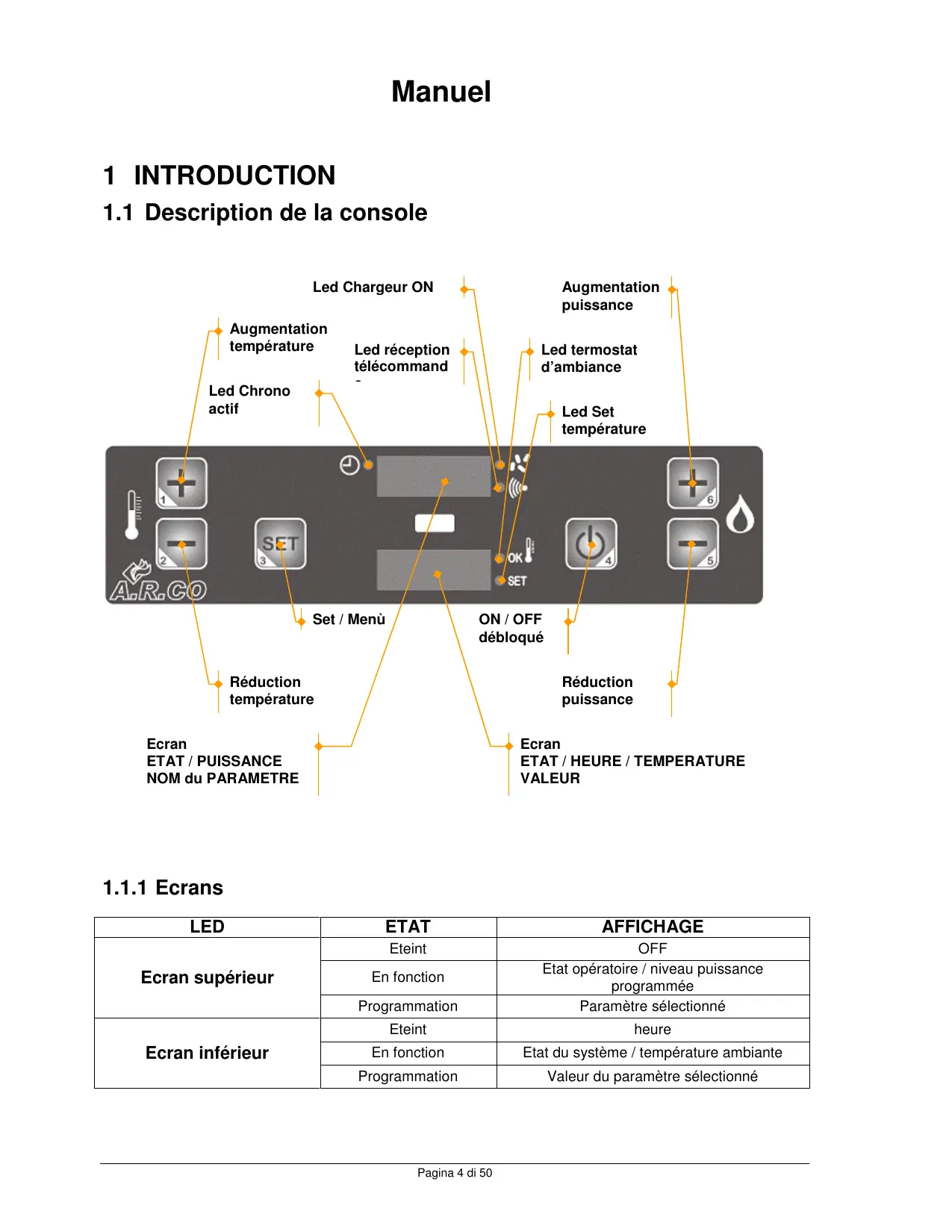 Réduit la valeur de la température du thermostat d’ambiance Réduit le paramètre sélectionné Visualise l’état opératoire du poele Permet l’accès au SET température et au menu des paramètres usager et technique par pressions successives Pressée 2 secondes allume ou éteint le poele. Bloque le poêle et le met en état d’arrêt Permet de sortir dumenu programmation à tout moment de la programmation. Les modifications sont mémorisées. Réduit la puissance rendue du poêle Augmente la puissance rendue du poêle