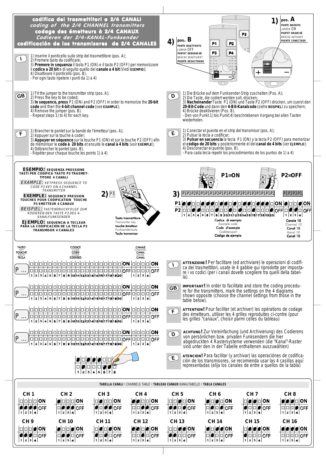 3) Appuyer en séquence sur la touche P1 (ON) et sur la touche P2 (OFF) afin de mémoriser le code à 20 bits et ensuite le canal à 4 bits (voir EXEMPLE); 4) Débrancher le pontet (pos. B). - Répéter pour chaque touche les points 1) à 4)