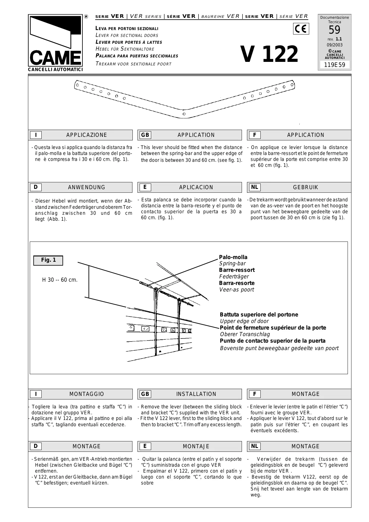 | Application | Distance entre levier et bord supérieur de la porte: 30 à 60 cm |