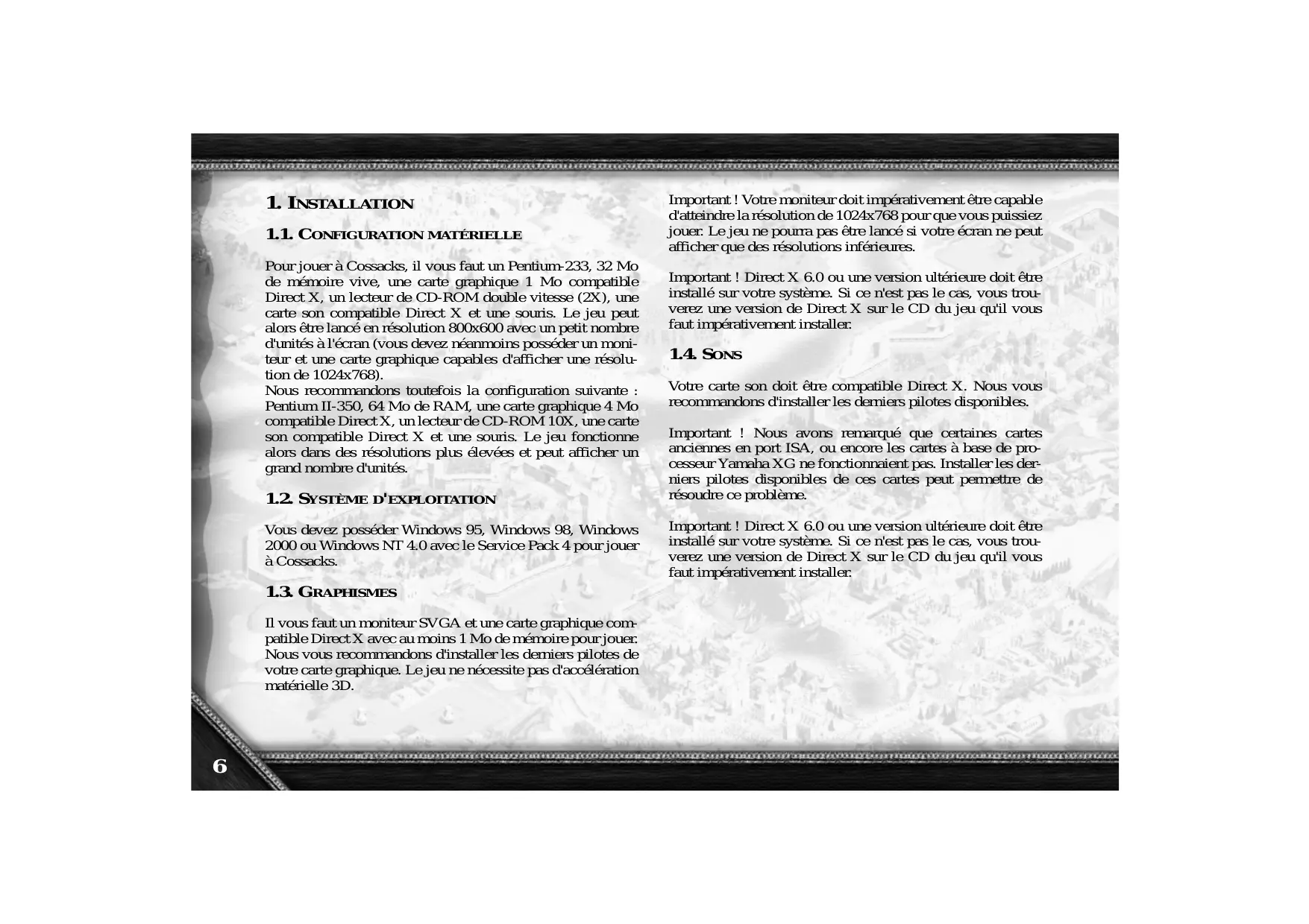 Vous devez posséder Windows 95, Windows 98, Windows 2000 ou Windows NT 4.0 avec le Service Pack 4 pour jouer à Cossacks. 1.3. GRAPHISMES Il vous faut un moniteur SVGA et une carte graphique compatible Direct X avec au moins 1 Mo de mémoire pour jouer. Nous vous recommandons d'installer les derniers pilotes de votre carte graphique. Le jeu ne nécessite pas d'accélération matérielle 3D.