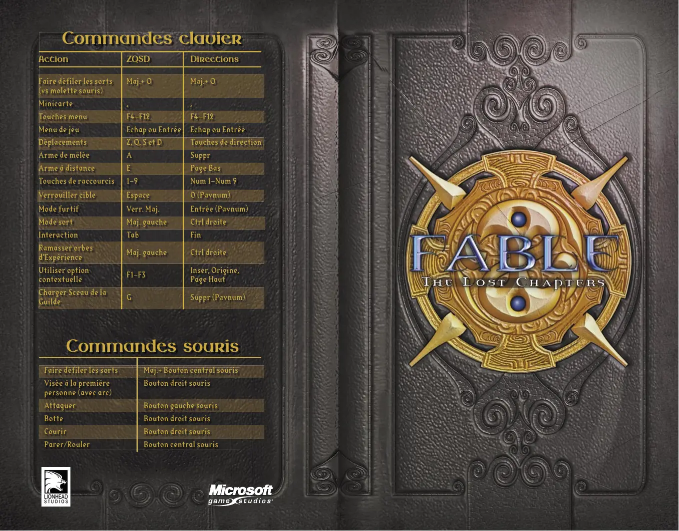 nformations sur la sécurité À propos des crises d’épilepsie photosensible Pour un très faible pourcentage de personnes, l’exposition à certains effets visuels, notamment les lumières ou motifs clignotants pouvant apparaître dans les jeux vidéo, risque de provoquer une crise d’épilepsie photosensible, même chez des personnes sans antécédent épileptique. Les symptômes de ces crises peuvent varier ; ils comprennent généralement des étourdissements, une altération de la vision, des mouvements convulsifs des yeux ou du visage, la crispation ou le tremblement des bras ou des jambes, une désorientation, une confusion ou une perte de connaissance momentanée. Ces crises peuvent également provoquer une perte de connaissance ou des convulsions pouvant engendrer des blessures dues à une chute sur le sol ou à un choc avec des objets avoisinants. Cessez immédiatement de jouer et consultez un médecin si vous ressentez de tels symptômes. Il est conseillé aux parents de surveiller leurs enfants et de leur poser des questions concernant les symptômes ci-dessus ; les enfants et les adolescents sont effectivement plus sujets à ce genre de crise que les adultes. Le risque de crise d’épilepsie photosensible peut être réduit en prenant les précautions suivantes : jouer dans une pièce bien éclairée ; ne pas jouer si la fatigue ou le sommeil se font sentir. Si vous, ou un membre de votre famille, avez des antécédents de crises d’épilepsie, consultez un médecin avant de jouer. Les informations contenues dans ce document, y compris les références à des URL ou à d’autres sites Web Internet, peuvent faire l’objet de modifications sans préavis. Sauf mention contraire, les noms de sociétés, les organisations, les produits, les noms de domaines, les adresses e-mails, les logos, les personnes, les lieux et les événements décrits dans ce document sont fictifs et toute ressemblance à une société, une organisation, un produit, un nom de domaine, une adresse e-mail, un logo, une personne, un lieu ou un événement réels ne serait que pure coïncidence. Il incombe à l’utilisateur de respecter toutes les lois applicables en matière de droits d’auteur. Sans limitation des droits issus des droits d’auteur, aucune partie de ce document ne peut être reproduite, stockée ou incluse dans un système de récupération de données, voire transmise à quelque fin ou par quelque moyen que ce soit (électronique, mécanique, photocopie, enregistrement ou autre) sans l’autorisation expresse et écrite de Microsoft Corporation. Les produits mentionnés dans ce document peuvent faire l’objet de brevets, de dépôts de brevets en cours, de marques, de droits d’auteur ou d’autres droits de propriété intellectuelle et industrielle de Microsoft. Sauf stipulation expresse contraire d’un contrat de licence écrit de Microsoft, la remise de ce document n’a pas pour effet de vous concéder une licence sur ces brevets, marques, droits d’auteur ou autres droits de propriété intellectuelle. Fable: The Lost Chapters © 2005 Lionhead Studios Limited. Lionhead, le logo Lionhead et Fable sont des marques déposées de Lionhead Studios Limited. Tous droits réservés. Publié et distribué par Microsoft Corporation. Microsoft, le logo Microsoft Game Studios et Windows sont des marques déposées ou commerciales de Microsoft Corporation aux États-Unis et/ou dans d’autres pays. Tous droits réservés. Toutes les autres marques et tous les autres noms de marques appartiennent à leurs propriétaires respectifs.