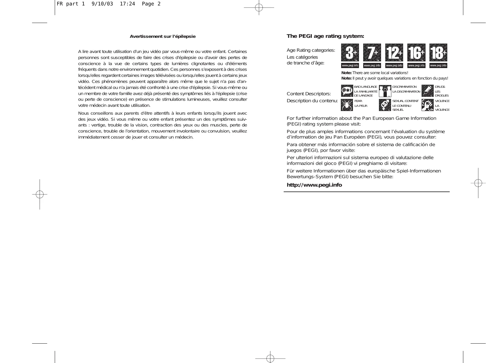 FR part 1 9/10/03 17:24 Page 2 Avertissement sur l’épilepsie A lire avant toute utilisation d’un jeu vidéo par vous-même ou votre enfant. Certaines personnes sont susceptibles de faire des crises d’épilepsie ou d’avoir des pertes de conscience à la vue de certains types de lumières clignotantes ou d’éléments fréquents dans notre environnement quotidien. Ces personnes s’exposent à des crises lorsqu’elles regardent certaines images télévisées ou lorsqu’elles jouent à certains jeux vidéo. Ces phénomènes peuvent apparaître alors même que le sujet n’a pas d’antécédent médical ou n’a jamais été confronté à une crise d’épilepsie. Si vous-même ou un membre de votre famille avez déjà présenté des symptômes liés à l’épilepsie (crise ou perte de conscience) en présence de stimulations lumineuses, veuillez consulter votre médecin avant toute utilisation. Nous conseillons aux parents d’être attentifs à leurs enfants lorsqu’ils jouent avec des jeux vidéo. Si vous même ou votre enfant présentez un des symptômes suivants : vertige, trouble de la vision, contraction des yeux ou des muscles, perte de conscience, trouble de l’orientation, mouvement involontaire ou convulsion, veuillez immédiatement cesser de jouer et consulter un médecin. The PEGI age rating system: Age Rating categories: Les catégories de tranche d’âge: