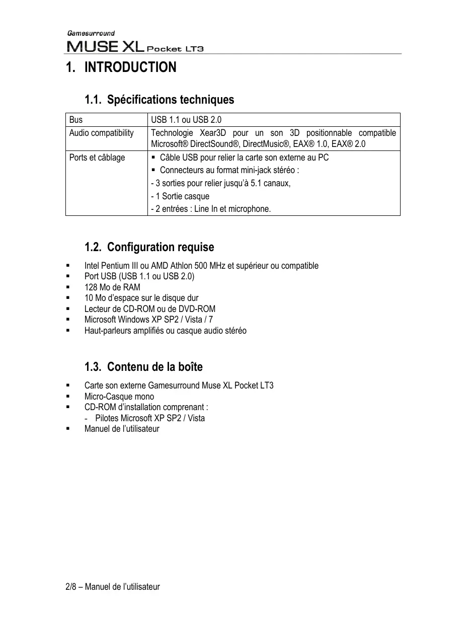 Carte son externe Gamesurround Muse XL Pocket LT3 Micro-Casque mono CD-ROM d’installation comprenant : - Pilotes Microsoft XP SP2 / Vista Manuel de l’utilisateur
