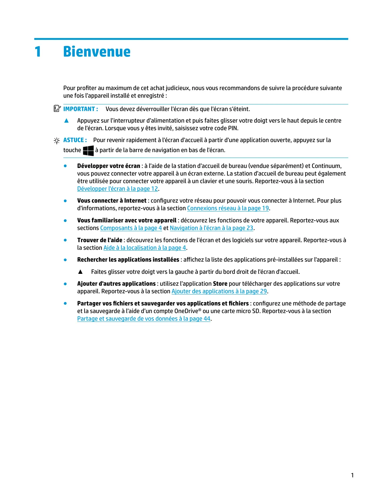 - Manuel de l'utilisateur © Copyright 2016 HP Development Company, L.P. Bluetooth est une marque détenue par son propriétaire et utilisée sous licence par HP Inc. MicroSD est une marque commerciale ou une marque déposée de SD-3C aux États-Unis et/ou dans d'autres pays. OneDrive et Windows sont des marques commerciales déposées ou des marques commerciales de Microsoft Corporation aux États-Unis et/ou dans d'autres pays. Les informations contenues dans ce document peuvent être modifiées sans préavis. Les garanties relatives aux produits et aux services HP sont décrites dans les déclarations de garantie limitée expresse qui les accompagnent. Aucun élément du présent document ne peut être interprété comme constituant une garantie supplémentaire. HP ne saurait être tenu pour responsable des erreurs ou omissions de nature technique ou rédactionnelle qui pourraient subsister dans le présent document. Deuxième édition : octobre 2016 Première édition : juillet 2016 Référence du document : 855137-052 Informations sur le produit Conditions d'utilisation du logiciel Ce manuel de l'utilisateur décrit des fonctions communes à la plupart des modèles. Cependant, certaines fonctions peuvent ne pas être disponibles sur votre appareil. En installant, copiant, téléchargeant ou utilisant tout logiciel préinstallé sur cet appareil, vous reconnaissez être lié par les termes du contrat de licence utilisateur final (CLUF) HP. Si vous êtes en désaccord avec les termes de ce contrat, votre seul recours consiste à retourner le produit non utilisé dans sa totalité (matériel et logiciels) sous 14 jours pour un remboursement intégral conformément à la politique en matière de remboursement de votre vendeur. Toutes les fonctionnalités ne sont pas disponibles dans toutes les éditions ou versions de Windows. Ce système peut nécessiter du matériel, des pilotes, des logiciels ou un BIOS mis à niveau et/ou achetés séparément, afin de profiter pleinement des fonctionnalités de Windows. Windows 10 est mis à jour automatiquement et est toujours activé. Des frais ISP sont susceptibles de s'appliquer et au fil du temps, des exigences supplémentaires peuvent s’appliquer aux mises à jour. Reportez-vous à la section http://www.microsoft.com. Pour accéder aux derniers manuels ou guides de l'utilisateur de votre produit, rendez-vous sur http://www.hp.com/support. Sélectionnez Rechercher votre produit, puis suivez les instructions à l'écran. Pour obtenir plus d'informations ou pour demander un remboursement intégral du prix de l'appareil, prenez contact avec votre vendeur. Sommaire 1 Bienvenue p. 1