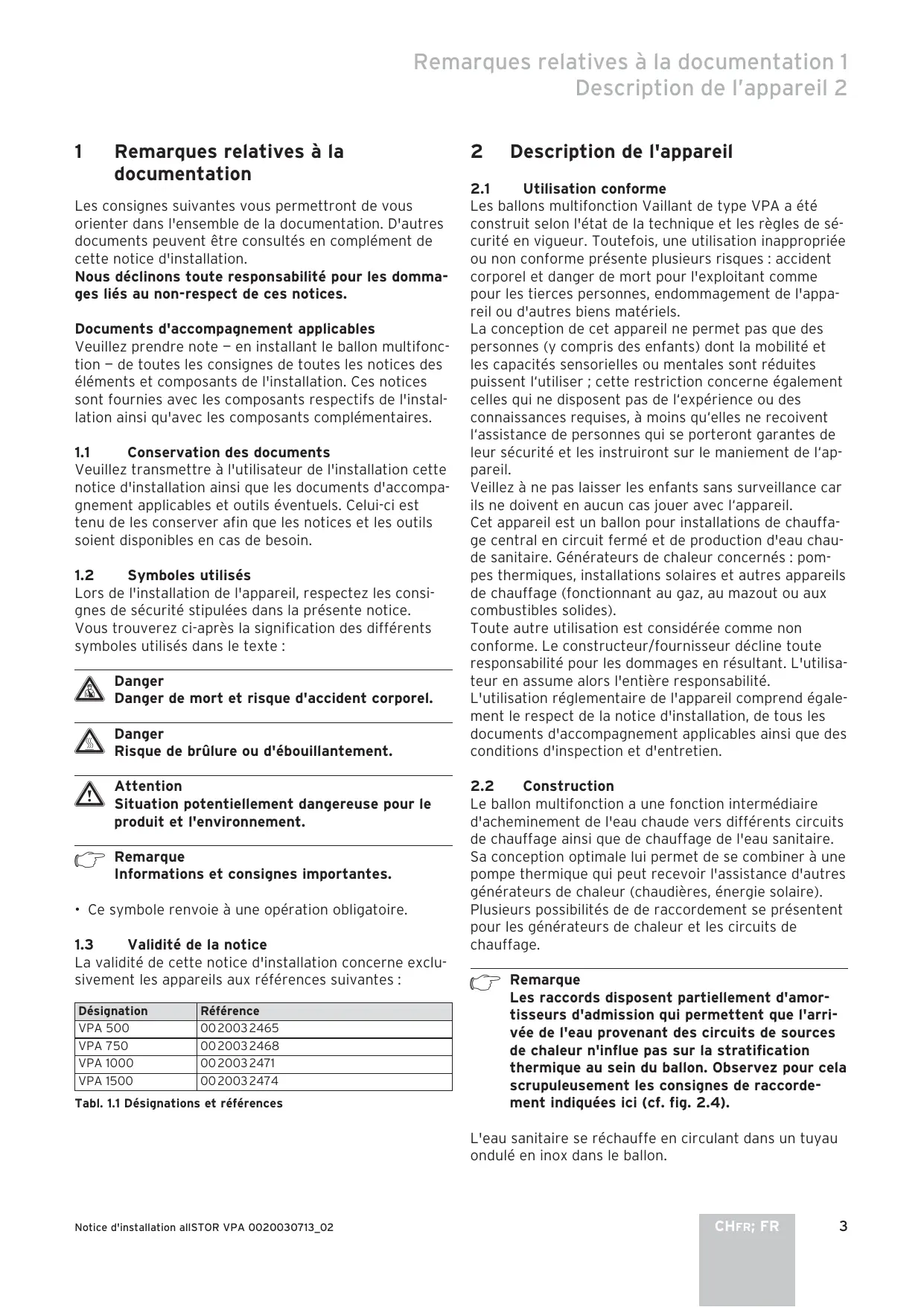 h Remarque Informations et consignes importantes. • Ce symbole renvoie à une opération obligatoire. 1.3 Validité de la notice La validité de cette notice d'installation concerne exclusivement les appareils aux références suivantes : Désignation VPA 500 VPA 750 VPA 1000 VPA 1500