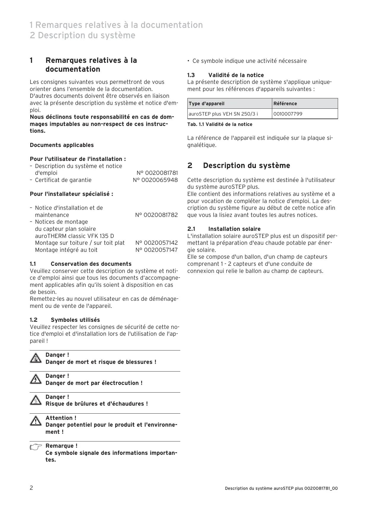 Documents applicables Pour l'utilisateur de l'installation : – Description du système et notice d'emploi – Certificat de garantie