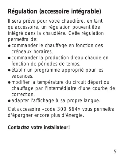 Régulation (accessoire intégrable) Il sera prévu pour votre chaudière, en tant qu'accessoire, un régulation pouvant être intégré dans la chaudière. Cette régulation permettra de: ● commander le chauffage en fonction des créneaux horaires, ● commander la production d'eau chaude en fonction de périodes de temps, ● établir un programme approprié pour les vacances, ● modifier la température du circuit départ du chauffage par l'intermédiaire d'une courbe de correction, ● adapter l'affichage à sa propre langue. Cet accessoire «code 300 664» vous permettra d'épargner encore plus d'énergie. Contactez votre installateur!