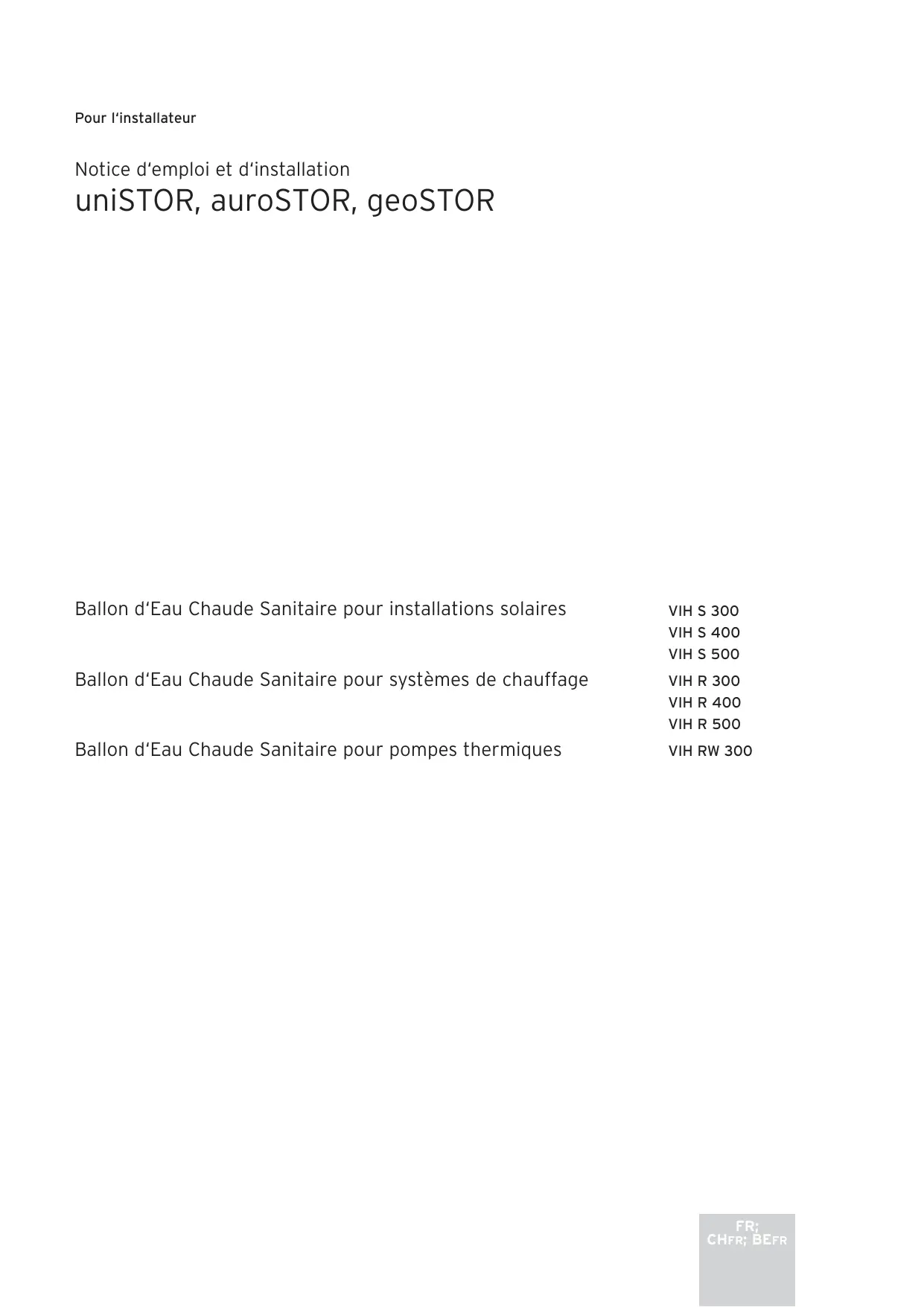 Consignes de sécurité Les ballons solaires VIN S 300/400/500, les ballons VIH R 300/400/500 et VIH RW 300 ne doivent être installés que par un professionnel qualifié responsable du respect des prescriptions, règlements et directives en vigueur. Si vous souhaitez bénéficier de la garantie constructeur, l‘appareil doit impérativement avoir été installé par un installateur qualifié et agréé. Celui-ci est également responsable de l’inspection/de l’entretien, des réparations et modifications effectuées sur les ballons. FR; CHFR; BEFR
