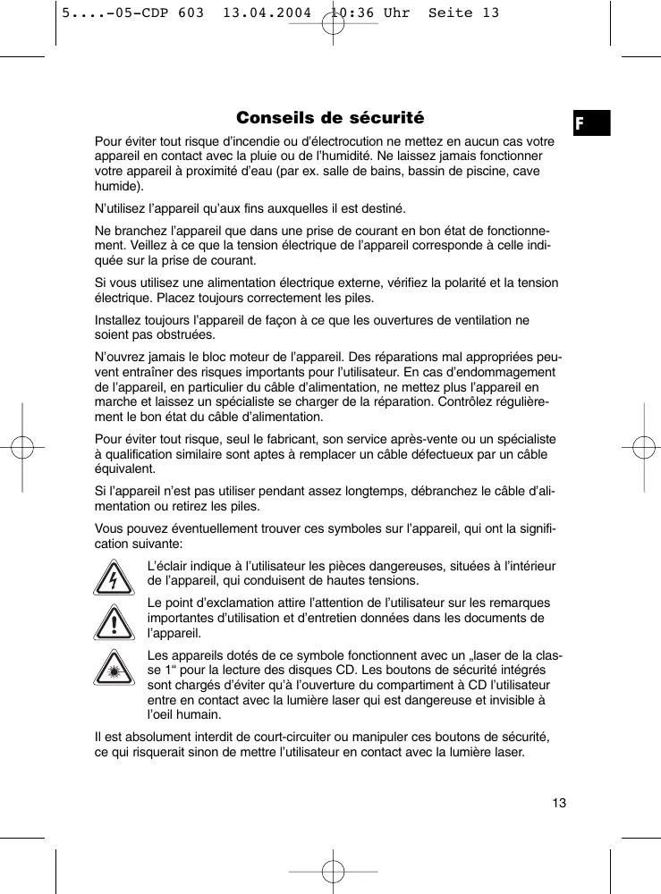 Les apparèils dotés de ce symbole fonctionnent avec un „laser de la classe 1" pour la lecture des disques CD. Les boutons de sécurité intégrés sont charges d'évitier qu'à l'ouverture du compartment à CD l'utilisateur entre en contact avec la lumière laser qui est dangereuse et invisible à l'oeil humain.