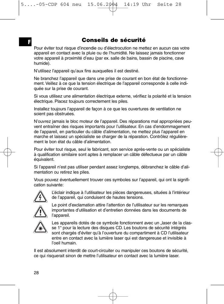 Les apparèils dotés de ce symbole fonctionnent avec un „laser de la classe 1" pour la lecture des disques CD. Les boutons de sécurité intégrés sont charges d'évitant qu'à l'ouverture du compartment à CD l'utilisateur entre en contact avec la lumière laser qui est dangereuse et invisible à l'oeil humain.