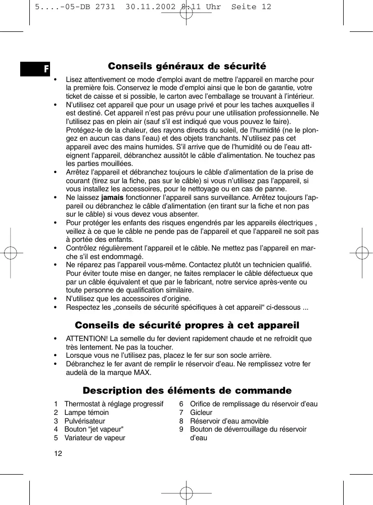 ATTENTION! La semelle du fer devient rapidement chaude et ne refroidit que très lentement. Ne pas la toucher.