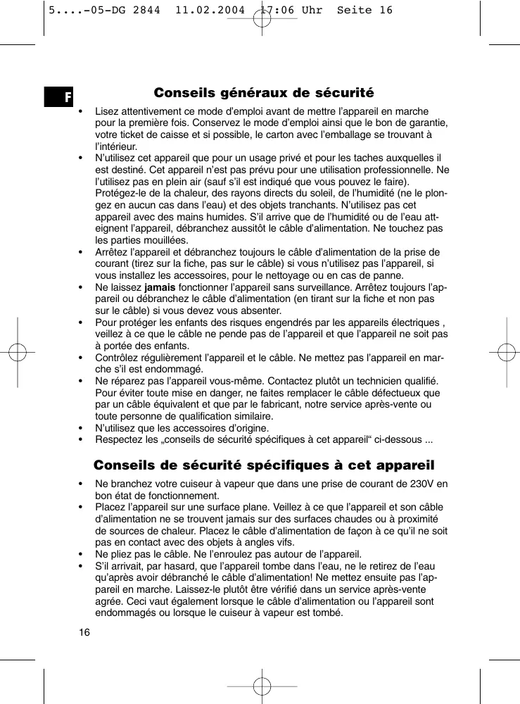 S'il arrivait, par hasard, que l'appareil tombe dans l'eau, ne le retirez de l'eau qu'aupres avoir débranché le cable d'alimentation! Ne mette ensuite pas l'appareil en marche. Laissez-le plutôt être vérifié dans un service après-venture/agree. Ceci vaut également lorsque le cable d'alimentation ou l'appareil sont endommagés ou lorsque le cuisseur à vapeur est tombé.