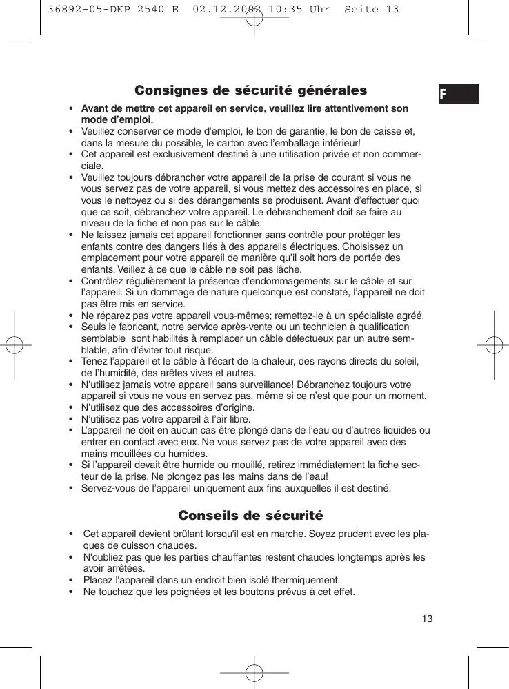 Tenez l'appareil et le cable à l'écart de la chaleur, des rayons directs du soleil, de l'humidité, des arêtes vives et autres. - N'utilise jamais votre apparéil sans surveillance! Débranchez toujours votre apparéil si vous ne vous en servez pas, même si ce n'est que pour un moment.