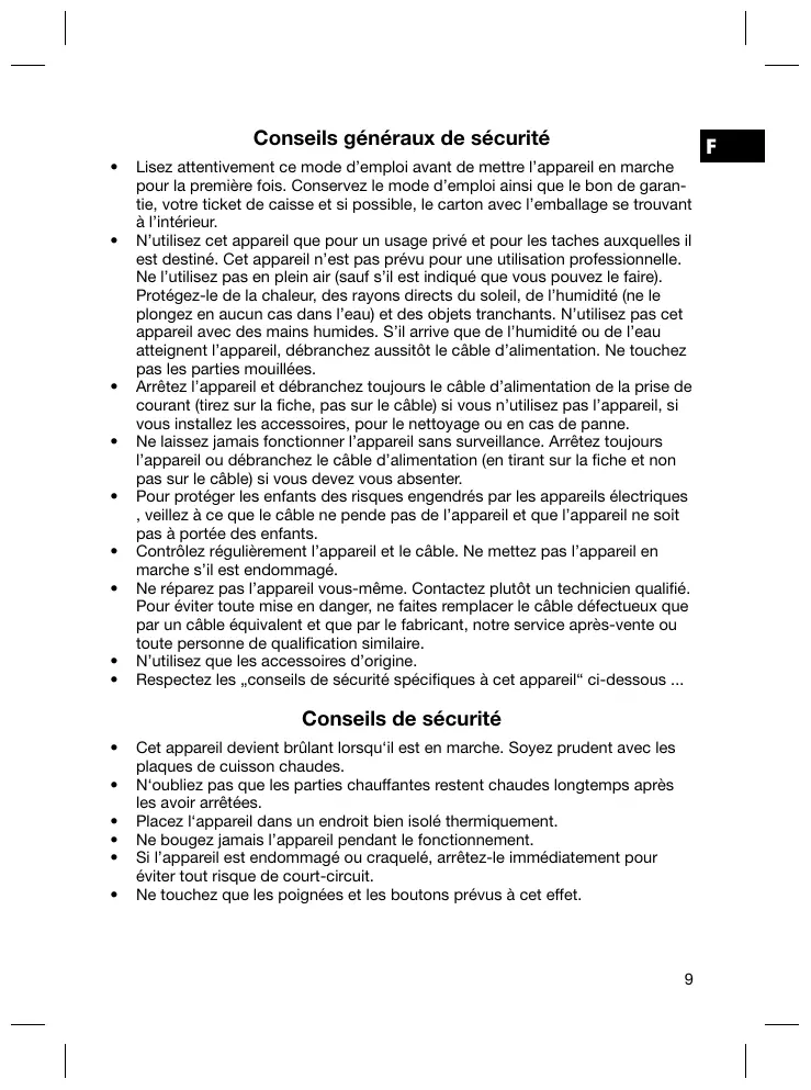 F Lisez attentivement ce mode d’emploi avant de mettre l’appareil en marche pour la première fois. Conservez le mode d’emploi ainsi que le bon de garantie, votre ticket de caisse et si possible, le carton avec l’emballage se trouvant