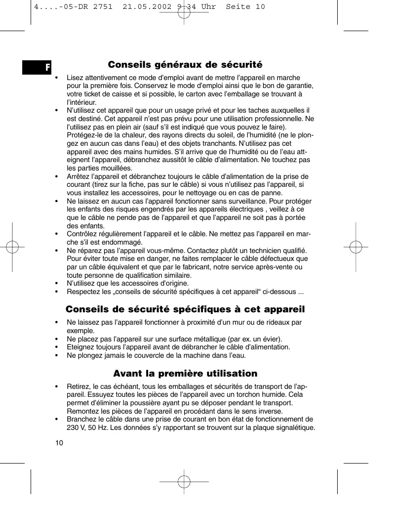 Ne laissez pas l’appareil fonctionner à proximité d’un mur ou de rideaux par exemple. Ne placez pas l’appareil sur une surface métallique (par ex. un évier). Eteignez toujours l’appareil avant de débrancher le câble d’alimentation. Ne plongez jamais le couvercle de la machine dans l’eau. Avant la première utilisation