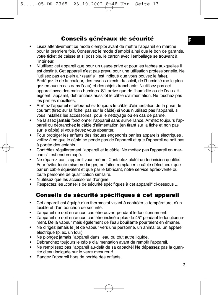 Cet appareil est équipé d’un thermostat visant à contrôler la température, d’un fusible et d’un bouchon de sécurité. L’appareil ne doit en aucun cas être ouvert pendant le fonctionnement. L’appareil ne doit en aucun cas être incliné à plus de 45° pendant le fonctionnement. De la vapeur mais également de l’eau bouillante pourraient en émaner. Ne dirigez jamais le jet de vapeur vers une personne, un animal ou un appareil électrique (p. ex. un four). Ne plongez jamais l’appareil dans l’eau ou tout autre liquide. Débranchez toujours le câble d’alimentation avant de remplir l’appareil. Ne remplissez pas l’appareil au-delà de sa capacité! Ne dépassez pas la quantité d’eau indiquée sur le verre mesureur! Rangez l’appareil hors de portée des enfants.