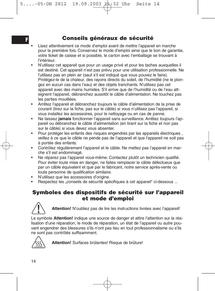 Lisez attentivement ce mode d’emploi avant de mettre l’appareil en marche pour la première fois. Conservez le mode d’emploi ainsi que le bon de garantie, votre ticket de caisse et si possible, le carton avec l’emballage se trouvant à l’intérieur. N’utilisez cet appareil que pour un usage privé et pour les taches auxquelles il est destiné. Cet appareil n’est pas prévu pour une utilisation professionnelle. Ne l’utilisez pas en plein air (sauf s’il est indiqué que vous pouvez le faire). Protégez-le de la chaleur, des rayons directs du soleil, de l’humidité (ne le plongez en aucun cas dans l’eau) et des objets tranchants. N’utilisez pas cet appareil avec des mains humides. S’il arrive que de l’humidité ou de l’eau atteignent l’appareil, débranchez aussitôt le câble d’alimentation. Ne touchez pas les parties mouillées. Arrêtez l’appareil et débranchez toujours le câble d’alimentation de la prise de courant (tirez sur la fiche, pas sur le câble) si vous n’utilisez pas l’appareil, si vous installez les accessoires, pour le nettoyage ou en cas de panne. Ne laissez jamais fonctionner l’appareil sans surveillance. Arrêtez toujours l’appareil ou débranchez le câble d’alimentation (en tirant sur la fiche et non pas sur le câble) si vous devez vous absenter. Pour protéger les enfants des risques engendrés par les appareils électriques , veillez à ce que le câble ne pende pas de l’appareil et que l’appareil ne soit pas à portée des enfants. Contrôlez régulièrement l’appareil et le câble. Ne mettez pas l’appareil en marche s’il est endommagé. Ne réparez pas l’appareil vous-même. Contactez plutôt un technicien qualifié. Pour éviter toute mise en danger, ne faites remplacer le câble défectueux que par un câble équivalent et que par le fabricant, notre service après-vente ou toute personne de qualification similaire. N’utilisez que les accessoires d’origine. Respectez les „conseils de sécurité spécifiques à cet appareil“ ci-dessous ... Symboles des dispositifs de sécurité sur l’appareil et mode d’emploi Attention! N’oubliez pas de lire les instructions livrées avec l’appareil! Le symbole Attention! indique une source de danger et attire l’attention sur la réalisation d’une réparation, le mode de réparation, un état de l’appareil ou autre pouvant engendrer des blessures s’ils n’ont pas lieu en tout professionnalisme ou s’ils ne sont pas contrôlés suffisamment. Attention! Surfaces brûlantes! Risque de brûlure!