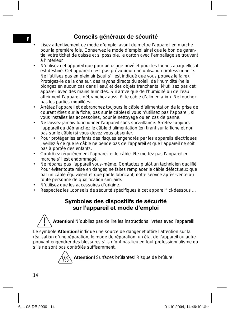 Lisez attentivement ce mode d’emploi avant de mettre l’appareil en marche pour la première fois. Conservez le mode d’emploi ainsi que le bon de garantie, votre ticket de caisse et si possible, le carton avec l’emballage se trouvant à l’intérieur. N’utilisez cet appareil que pour un usage privé et pour les taches auxquelles il est destiné. Cet appareil n’est pas prévu pour une utilisation professionnelle. Ne l’utilisez pas en plein air (sauf s’il est indiqué que vous pouvez le faire). Protégez-le de la chaleur, des rayons directs du soleil, de l’humidité (ne le plongez en aucun cas dans l’eau) et des objets tranchants. N’utilisez pas cet appareil avec des mains humides. S’il arrive que de l’humidité ou de l’eau atteignent l’appareil, débranchez aussitôt le câble d’alimentation. Ne touchez pas les parties mouillées. Arrêtez l’appareil et débranchez toujours le câble d’alimentation de la prise de courant (tirez sur la fiche, pas sur le câble) si vous n’utilisez pas l’appareil, si vous installez les accessoires, pour le nettoyage ou en cas de panne. Ne laissez jamais fonctionner l’appareil sans surveillance. Arrêtez toujours l’appareil ou débranchez le câble d’alimentation (en tirant sur la fiche et non pas sur le câble) si vous devez vous absenter. Pour protéger les enfants des risques engendrés par les appareils électriques , veillez à ce que le câble ne pende pas de l’appareil et que l’appareil ne soit pas à portée des enfants. Contrôlez régulièrement l’appareil et le câble. Ne mettez pas l’appareil en marche s’il est endommagé. Ne réparez pas l’appareil vous-même. Contactez plutôt un technicien qualifié. Pour éviter toute mise en danger, ne faites remplacer le câble défectueux que par un câble équivalent et que par le fabricant, notre service après-vente ou toute personne de qualification similaire. N’utilisez que les accessoires d’origine. Respectez les „conseils de sécurité spécifiques à cet appareil“ ci-dessous ... Symboles des dispositifs de sécurité sur l’appareil et mode d’emploi Attention! N’oubliez pas de lire les instructions livrées avec l’appareil! Le symbole Attention! indique une source de danger et attire l’attention sur la réalisation d’une réparation, le mode de réparation, un état de l’appareil ou autre pouvant engendrer des blessures s’ils n’ont pas lieu en tout professionnalisme ou s’ils ne sont pas contrôlés suffisamment. Attention! Surfaces brûlantes! Risque de brûlure!