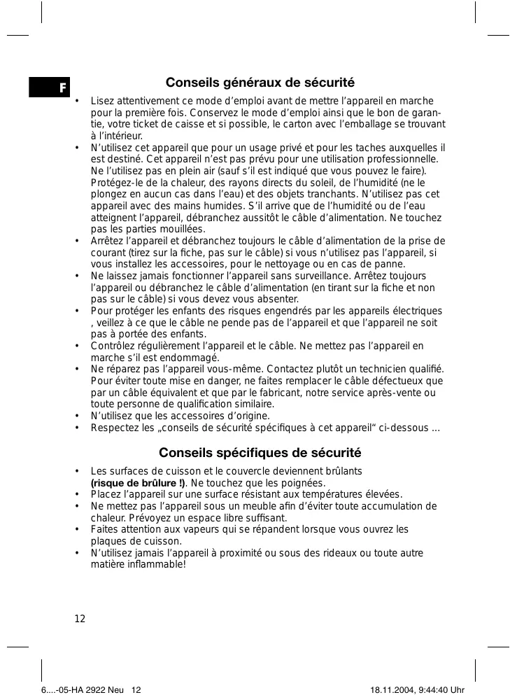 - N'utilisez cet apparéil que pour un usage隱私 et pour les taches auxquelles il est destiné. Cét apparéil n'est pas prévu pour une utilisation professionnelle. Ne l'utilisez pas en plein air (sauf s'il est indiqued que vous pouvez le faire). Protégéze-le de la chaleur, des rayons directs du soleil, de l'humidité (ne le plongez en aucun cas dans l'eau) et des objets tranchants. N'utilisez pas cet apparéil avec des mains humides. S'il arrive que de l'humidité ou de l'eau atteignent l' apparéil, débranchez aussilot le cable d'alimentation. Ne touchez pas les parties mouillées.