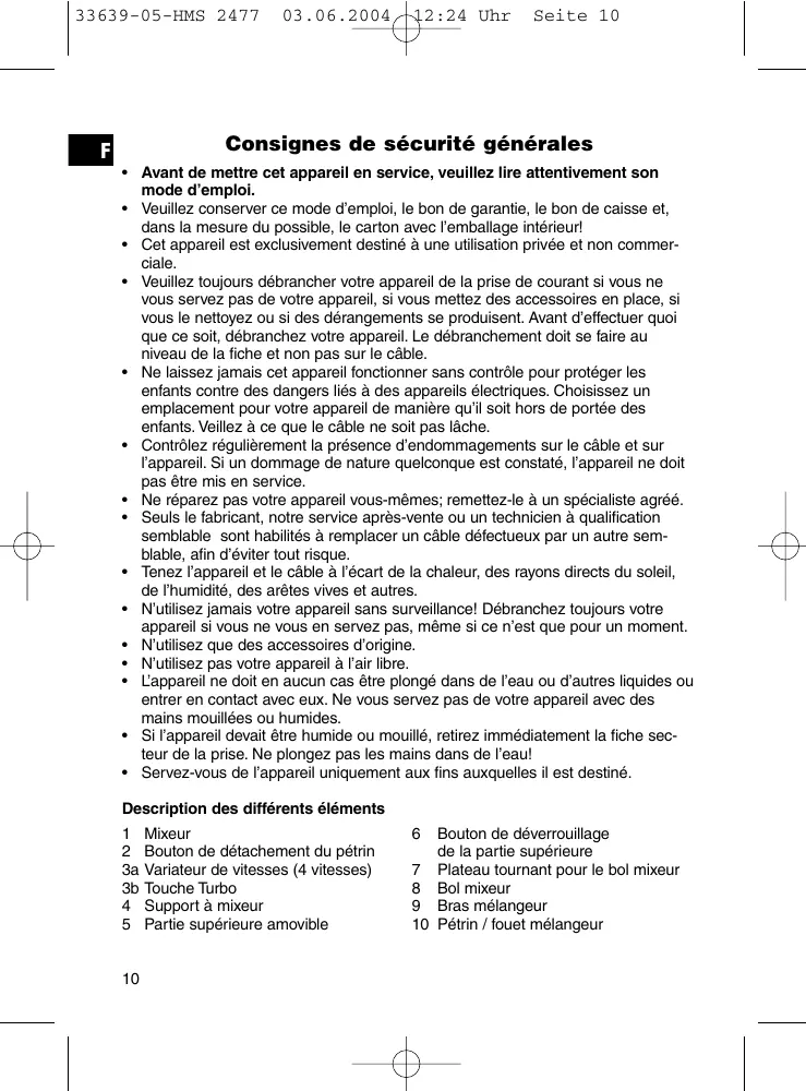 Bouton de déverrouillage de la partie supérieure 7 Plateau tournant pour le bol mixeur 8 Bol mixeur 9 Bras mélangeur 10 Pétrin / fouet mélangeur 33639-05-HMS 2477