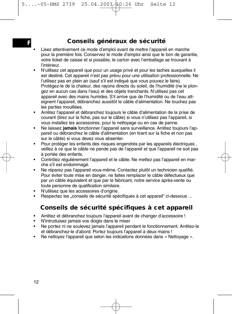 Arrêtez et débranchez toujours l’appareil avant de changer d’accessoire ! N’introduisez jamais vos doigts dans le mixer Ne portez ni ne soulevez jamais l’appareil pendant le fonctionnement. Arrêtez-le et débranchez-le d’abord. Portez toujours l’appareil à deux mains ! Ne nettoyez l’appareil que selon les indications données dans « Nettoyage ». 5....-05-HMS 2739