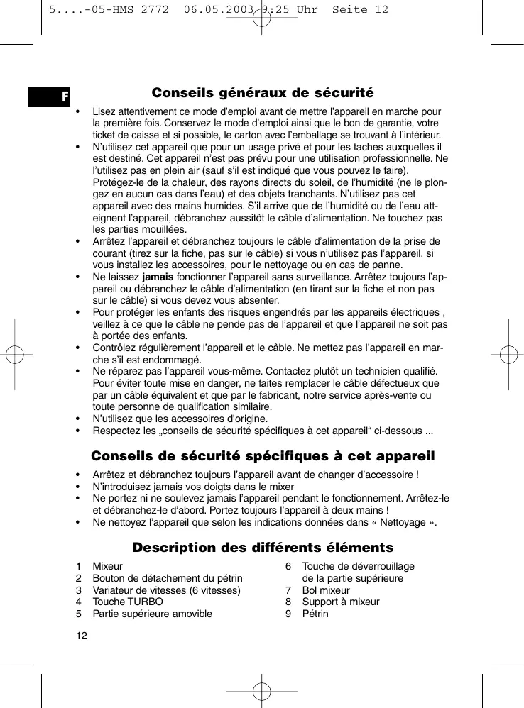 Arrêtez et débranchez toujours l’appareil avant de changer d’accessoire ! N’introduisez jamais vos doigts dans le mixer Ne portez ni ne soulevez jamais l’appareil pendant le fonctionnement. Arrêtez-le et débranchez-le d’abord. Portez toujours l’appareil à deux mains ! Ne nettoyez l’appareil que selon les indications données dans « Nettoyage ».