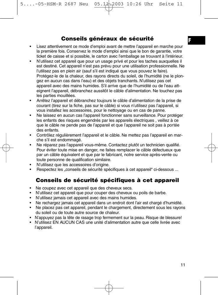 N’utilisez cet appareil que pour couper des cheveux ou poils de barbe. N’utilisez jamais cet appareil avec des mains humides. Ne rechargez jamais cet appareil dans un endroit dont l’air est chargé d’humidité. Ne placez pas cet appareil, pendant le chargement, directement sous les rayons du soleil ou de toute autre source de chaleur. • N’appuyez pas la tête de rasage trop fermement sur la peau. Risque de blessure! • N’utilisez EN AUCUN CAS une unité d’alimentation autre que celle livrée avec l’appareil.