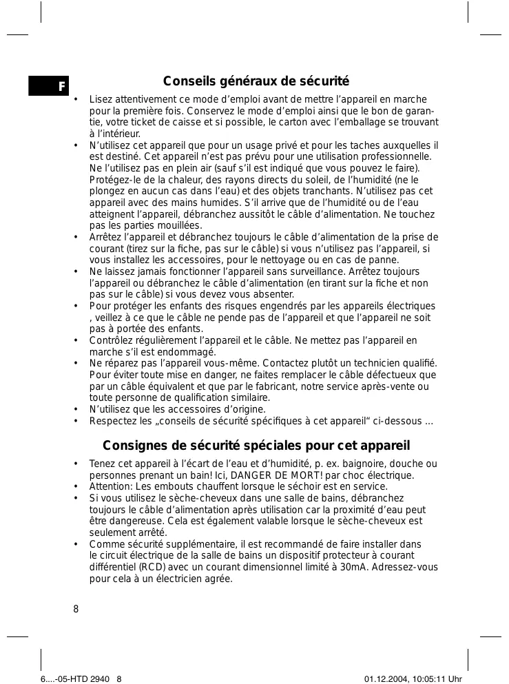 Attention: Les embouts chauffent lorsque le séchoir est en service. Si vous utilisez le sèche-cheveux dans une salle de bains, débranchez toujours le câble d’alimentation après utilisation car la proximité d’eau peut être dangereuse. Cela est également valable lorsque le sèche-cheveux est seulement arrêté. Comme sécurité supplémentaire, il est recommandé de faire installer dans le circuit électrique de la salle de bains un dispositif protecteur à courant différentiel (RCD) avec un courant dimensionnel limité à 30mA. Adressez-vous pour cela à un électricien agrée.