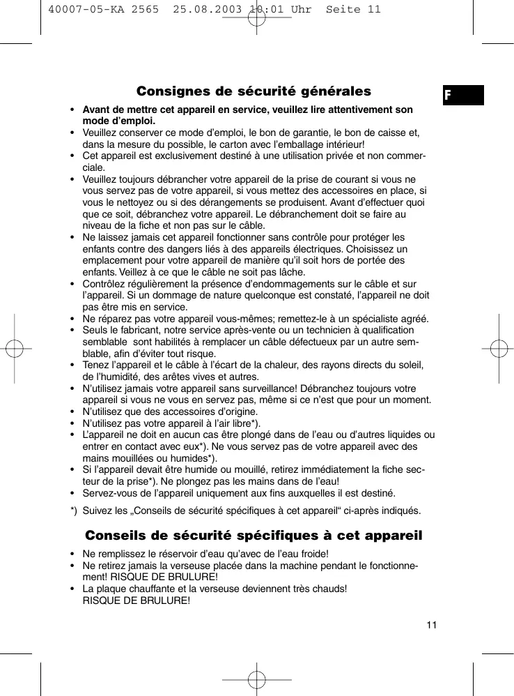 • Veuillez conserver ce mode d’emploi, le bon de garantie, le bon de caisse et, dans la mesure du possible, le carton avec l’emballage intérieur! • Cet appareil est exclusivement destiné à une utilisation privée et non commerciale. • Veuillez toujours débrancher votre appareil de la prise de courant si vous ne vous servez pas de votre appareil, si vous mettez des accessoires en place, si vous le nettoyez ou si des dérangements se produisent. Avant d’effectuer quoi que ce soit, débranchez votre appareil. Le débranchement doit se faire au niveau de la fiche et non pas sur le câble. • Ne laissez jamais cet appareil fonctionner sans contrôle pour protéger les enfants contre des dangers liés à des appareils électriques. Choisissez un emplacement pour votre appareil de manière qu’il soit hors de portée des enfants. Veillez à ce que le câble ne soit pas lâche. • Contrôlez régulièrement la présence d’endommagements sur le câble et sur l’appareil. Si un dommage de nature quelconque est constaté, l’appareil ne doit pas être mis en service. • Ne réparez pas votre appareil vous-mêmes; remettez-le à un spécialiste agréé. • Seuls le fabricant, notre service après-vente ou un technicien à qualification semblable sont habilités à remplacer un câble défectueux par un autre semblable, afin d’éviter tout risque. • Tenez l’appareil et le câble à l’écart de la chaleur, des rayons directs du soleil, de l’humidité, des arêtes vives et autres. • N’utilisez jamais votre appareil sans surveillance! Débranchez toujours votre appareil si vous ne vous en servez pas, même si ce n’est que pour un moment. • N’utilisez que des accessoires d’origine. • N’utilisez pas votre appareil à l’air libre*). • L’appareil ne doit en aucun cas être plongé dans de l’eau ou d’autres liquides ou entrer en contact avec eux*). Ne vous servez pas de votre appareil avec des mains mouillées ou humides*). • Si l’appareil devait être humide ou mouillé, retirez immédiatement la fiche secteur de la prise*). Ne plongez pas les mains dans de l’eau! • Servez-vous de l’appareil uniquement aux fins auxquelles il est destiné. *) Suivez les „Conseils de sécurité spécifiques à cet appareil“ ci-après indiqués.