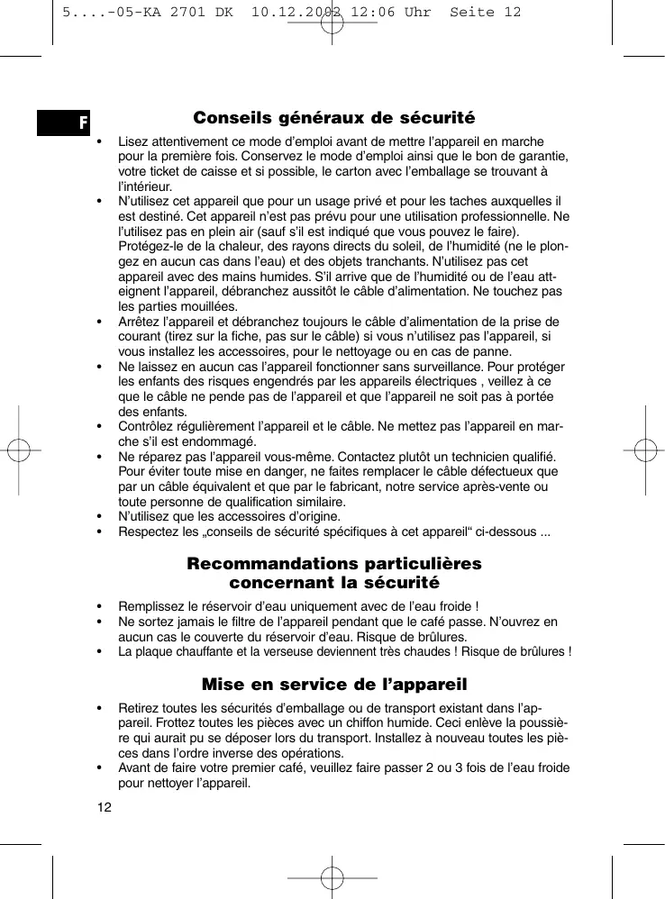 N’utilisez cet appareil que pour un usage privé et pour les taches auxquelles il est destiné. Cet appareil n’est pas prévu pour une utilisation professionnelle. Ne l’utilisez pas en plein air (sauf s’il est indiqué que vous pouvez le faire). Protégez-le de la chaleur, des rayons directs du soleil, de l’humidité (ne le plongez en aucun cas dans l’eau) et des objets tranchants. N’utilisez pas cet appareil avec des mains humides. S’il arrive que de l’humidité ou de l’eau atteignent l’appareil, débranchez aussitôt le câble d’alimentation. Ne touchez pas les parties mouillées. Arrêtez l’appareil et débranchez toujours le câble d’alimentation de la prise de courant (tirez sur la fiche, pas sur le câble) si vous n’utilisez pas l’appareil, si vous installez les accessoires, pour le nettoyage ou en cas de panne. Ne laissez en aucun cas l’appareil fonctionner sans surveillance. Pour protéger les enfants des risques engendrés par les appareils électriques , veillez à ce que le câble ne pende pas de l’appareil et que l’appareil ne soit pas à portée des enfants. Contrôlez régulièrement l’appareil et le câble. Ne mettez pas l’appareil en marche s’il est endommagé. Ne réparez pas l’appareil vous-même. Contactez plutôt un technicien qualifié. Pour éviter toute mise en danger, ne faites remplacer le câble défectueux que par un câble équivalent et que par le fabricant, notre service après-vente ou toute personne de qualification similaire. N’utilisez que les accessoires d’origine. Respectez les „conseils de sécurité spécifiques à cet appareil“ ci-dessous ...