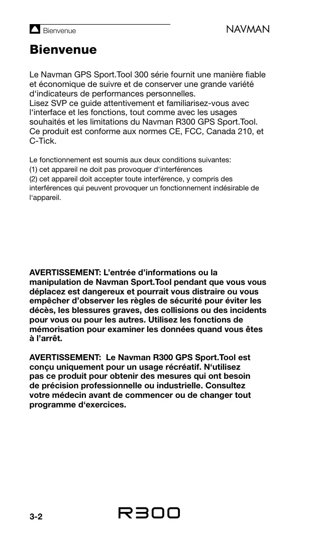 AVERTISSEMENT: Le Navman R300 GPS Sport Tool est concu uniquement pour un usage récréatif. N'utilissez pas ce produit pour obtenir des mesures qui ont besoin de précision professionnelle ou industrielle. Consultez votre médecin avant de commencer ou de changer tout programme d'exercices.