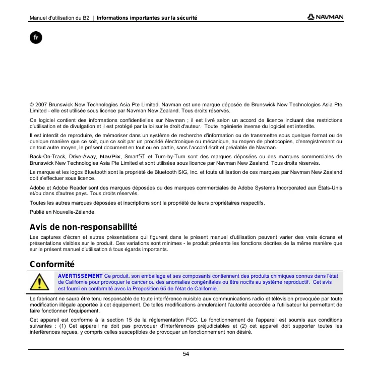 Limited - elle est utilisée sous licence par Navman New Zealand. Tous droits réservés. Ce logiciel contient des informations confidentielles sur Navman ; il est livré selon un accord de licence incluant des restrictions d'utilisation et de divulgation et il est protégé par la loi sur le droit d'auteur. Toute ingénierie inverse du logiciel est interdite. Il est interdit de reproduire, de mémoriser dans un système de recherche d'information ou de transmettre sous quelque format ou de quelque manière que ce soit, que ce soit par un procédé électronique ou mécanique, au moyen de photocopies, d'enregistrement ou de tout autre moyen, le présent document en tout ou en partie, sans l'accord écrit et préalable de Navman. Back-On-Track, Drive-Away, NavPix, Smart et Turn-by-Turn sont des marques déposées ou des marques commerciales de Brunswick New Technologies Asia Pte Limited et sont utilisées sous licence par Navman New Zealand. Tous droits réservés. La marque et les logos Bluetooth sont la propriété de Bluetooth SIG, Inc. et toute utilisation de ces marques par Navman New Zealand doit s'effectuer sous licence. Adobe et Adobe Reader sont des marques déposées ou des marques commerciales de Adobe Systems Incorporated aux États-Unis et/ou dans d'autres pays. Tous droits réservés. Toutes les autres marques déposées et inscriptions sont la propriété de leurs propriétaires respectifs. Publié en Nouvelle-Zélande.