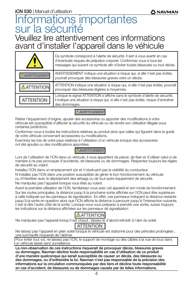 La non-observation de ces instructions risquerait de provoquer décès, blessures graves ou dommages. Navman décline toute responsabilité en cas d'utilisation de ce produit d'une manière quelconque qui serait susceptible de causeur un décès, des blessures ou des dommages, ou d'enfreindre la loi. Navman n'est pas responsable de la précision des informations sur la circulation communiquées par des tiers et décline toute responsabilité en cas d'accident, de blessures ou de dommages causés par de telles informations.