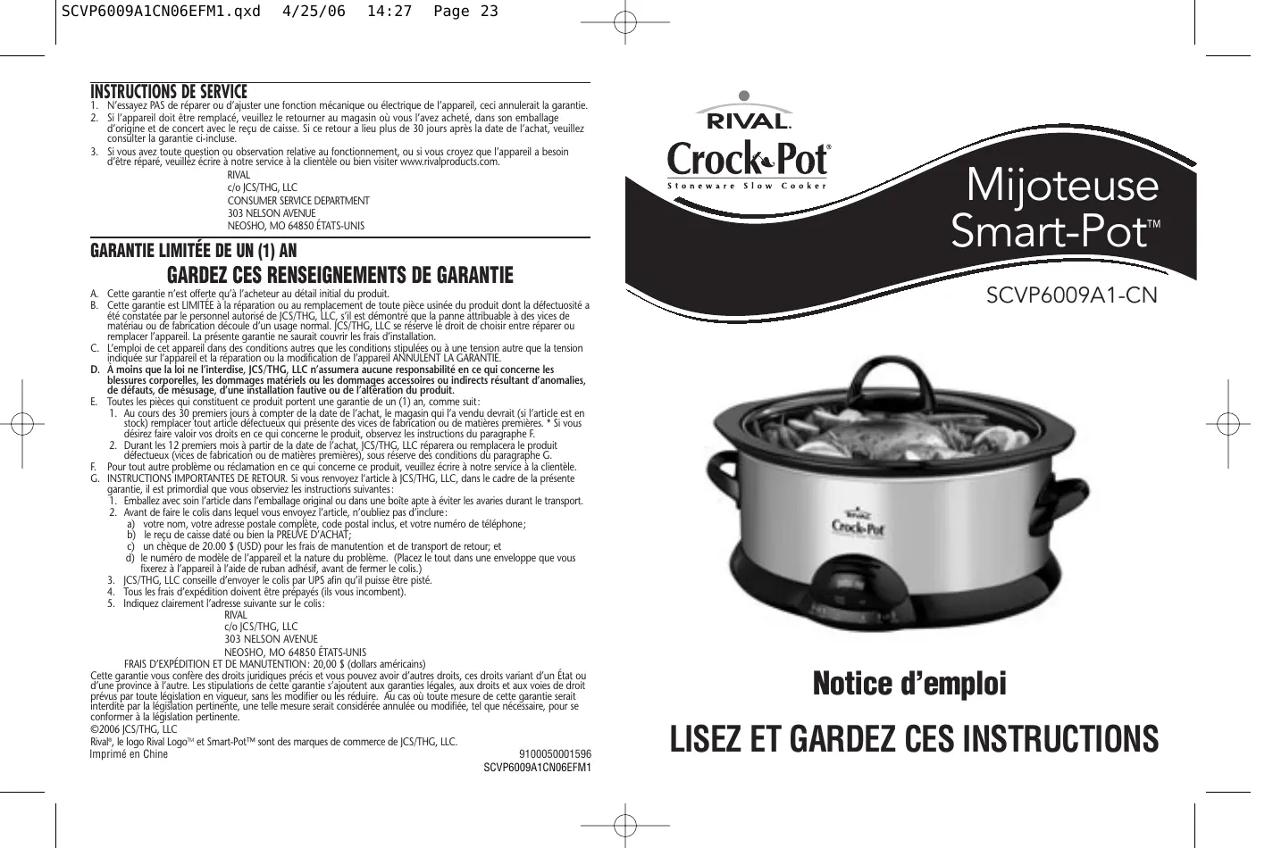 Rival®, le logo Rival LogoTM et Smart-Pot™ sont des marques de commerce de JCS/THG, LLC. Imprimé en Chine