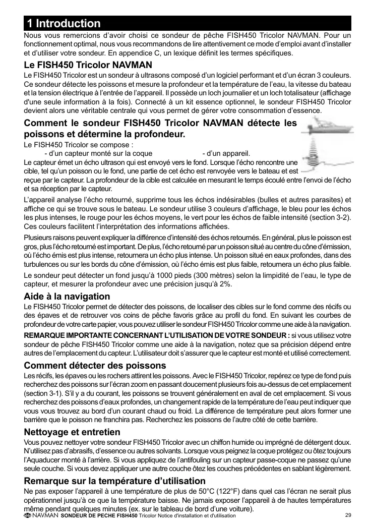 Nous vous remercions d’avoir choisi ce sondeur de pêche FISH450 Tricolor NAVMAN. Pour un fonctionnement optimal, nous vous recommandons de lire attentivement ce mode d’emploi avant d’installer et d’utiliser votre sondeur. En appendice C, un lexique définit les termes spécifiques.