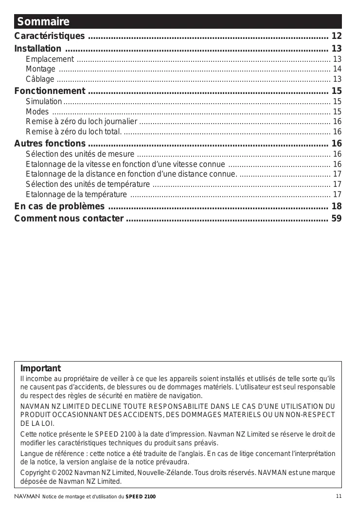 Il incombe au propriétaire de veiller à ce que les appareils soient installés et utilisés de telle sorte qu’ils ne causent pas d’accidents, de blessures ou de dommages matériels. L’utilisateur est seul responsable du respect des règles de sécurité en matière de navigation. NAVMAN NZ LIMITED DECLINE TOUTE RESPONSABILITE DANS LE CAS D’UNE UTILISATION DU PRODUIT OCCASIONNANT DES ACCIDENTS, DES DOMMAGES MATERIELS OU UN NON-RESPECT DE LA LOI. Cette notice présente le SPEED 2100 à la date d’impression. Navman NZ Limited se réserve le droit de modifier les caractéristiques techniques du produit sans préavis. Langue de référence : cette notice a été traduite de l’anglais. En cas de litige concernant l’interprétation de la notice, la version anglaise de la notice prévaudra. Copyright © 2002 Navman NZ Limited, Nouvelle-Zélande. Tous droits réservés. NAVMAN est une marque déposée de Navman NZ Limited. NAVMAN Notice de montage et d'utilisation du SPEED 2100