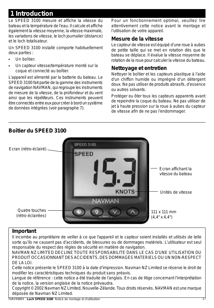 Cette notice présente le SPEED 3100 à la date d’impression. Navman NZ Limited se réserve le droit de modifier les caractéristiques techniques du produit sans préavis. Langue de référence : cette notice a été traduite de l’anglais. En cas de litige concernant l’interprétation de la notice, la version anglaise de la notice prévaudra. Copyright © 2002 Navman NZ Limited, Nouvelle-Zélande. Tous droits réservés. NAVMAN est une marque déposée de Navman NZ Limited. NAVMAN Loch SPEED 3100 Notice de montage et d’utilisation