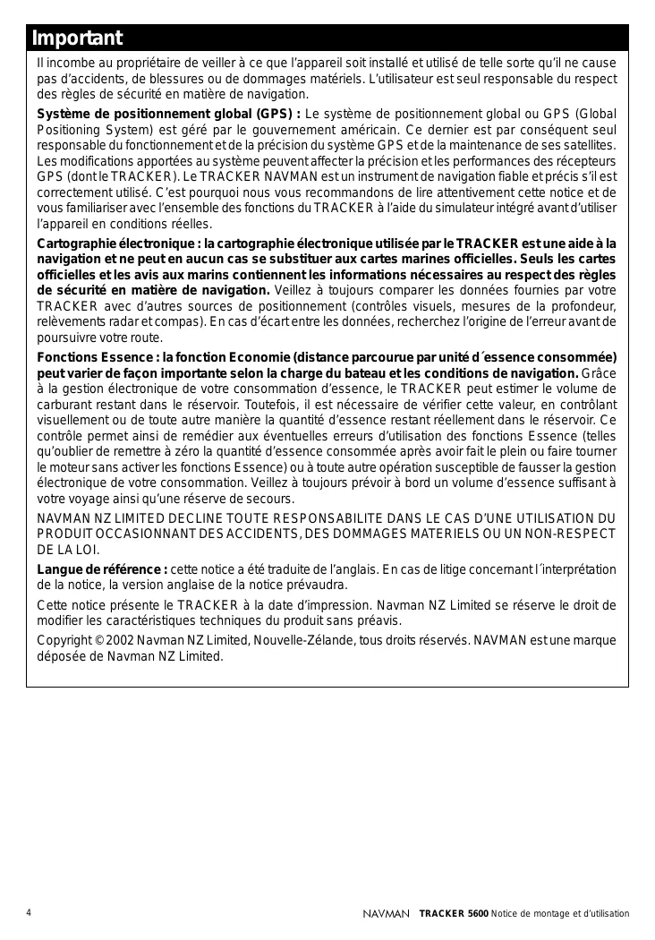 Positioning System) est géré par le gouvernement américain. Ce dernier est par conséquent seul responsable du fonctionnement et de la précision du système GPS et de la maintenance de ses satellites. Les modifications apportées au système peuvent affecter la précision et les performances des récepteurs GPS (dont le TRACKER). Le TRACKER NAVMAN est un instrument de navigation fiable et précis s’il est correctement utilisé. C’est pourquoi nous vous recommandons de lire attentivement cette notice et de vous familiariser avec l’ensemble des fonctions du TRACKER à l’aide du simulateur intégré avant d’utiliser l’appareil en conditions réelles. Cartographie électronique : la cartographie électronique utilisée par le TRACKER est une aide à la navigation et ne peut en aucun cas se substituer aux cartes marines officielles. Seuls les cartes officielles et les avis aux marins contiennent les informations nécessaires au respect des règles de sécurité en matière de navigation. Veillez à toujours comparer les données fournies par votre TRACKER avec d’autres sources de positionnement (contrôles visuels, mesures de la profondeur, relèvements radar et compas). En cas d’écart entre les données, recherchez l’origine de l’erreur avant de poursuivre votre route. Fonctions Essence : la fonction Economie (distance parcourue par unité d´essence consommée) peut varier de façon importante selon la charge du bateau et les conditions de navigation. Grâce à la gestion électronique de votre consommation d’essence, le TRACKER peut estimer le volume de carburant restant dans le réservoir. Toutefois, il est nécessaire de vérifier cette valeur, en contrôlant visuellement ou de toute autre manière la quantité d’essence restant réellement dans le réservoir. Ce contrôle permet ainsi de remédier aux éventuelles erreurs d’utilisation des fonctions Essence (telles qu’oublier de remettre à zéro la quantité d’essence consommée après avoir fait le plein ou faire tourner le moteur sans activer les fonctions Essence) ou à toute autre opération susceptible de fausser la gestion électronique de votre consommation. Veillez à toujours prévoir à bord un volume d’essence suffisant à votre voyage ainsi qu’une réserve de secours. NAVMAN NZ LIMITED DECLINE TOUTE RESPONSABILITE DANS LE CAS D’UNE UTILISATION DU PRODUIT OCCASIONNANT DES ACCIDENTS, DES DOMMAGES MATERIELS OU UN NON-RESPECT DE LA LOI. Langue de référence : cette notice a été traduite de l’anglais. En cas de litige concernant l´interprétation de la notice, la version anglaise de la notice prévaudra. Cette notice présente le TRACKER à la date d’impression. Navman NZ Limited se réserve le droit de modifier les caractéristiques techniques du produit sans préavis. Copyright © 2002 Navman NZ Limited, Nouvelle-Zélande, tous droits réservés. NAVMAN est une marque déposée de Navman NZ Limited.