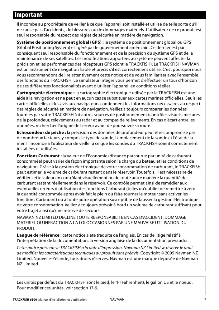 Important Il incombe au propriétaire de veiller à ce que l’appareil soit installé et utilisé de telle sorte qu’il ne cause pas d’accidents, de blessures ou de dommages matériels. L’utilisateur de ce produit est seul responsable du respect des règles de sécurité en matière de navigation. Système de positionnement global (GPS) : le système de positionnement global ou GPS (Global Positioning System) est géré par le gouvernement américain. Ce dernier est par conséquent seul responsable du fonctionnement et de la précision du système GPS et de la maintenance de ses satellites. Les modifications apportées au système peuvent affecter la précision et les performances des récepteurs GPS (dont le TRACKFISH). Le TRACKFISH NAVMAN est un instrument de navigation fiable et précis s’il est correctement utilisé. C’est pourquoi nous vous recommandons de lire attentivement cette notice et de vous familiariser avec l’ensemble des fonctions du TRACKFISH. Le simulateur intégré vous permet d’effectuer un tour d’horizon de ses différentes fonctionnalités avant d’utiliser l’appareil en conditions réelles. Cartographie électronique : la cartographie électronique utilisée par le TRACKFISH est une aide à la navigation et ne peut en aucun cas se substituer aux cartes marines officielles. Seuls les cartes officielles et les avis aux navigateurs contiennent les informations nécessaires au respect des règles de sécurité en matière de navigation. Veillez à toujours comparer les données fournies par votre TRACKFISH à d’autres sources de positionnement (contrôles visuels, mesures de la profondeur, relèvements au radar et au compas de relèvement). En cas d’écart entre les données, rechercher l’origine de l’erreur avant de poursuivre sa route. Echosondeur de pêche : la précision des données de profondeur peut être compromise par de nombreux facteurs, y compris le type de sonde, l’emplacement de la sonde et l’état de la mer. Il incombe à l’utilisateur de veiller à ce que les sondes du TRACKFISH soient correctement installées et utilisées. Fonctions Carburant : la valeur de l’Economie (distance parcourue par unité de carburant consommée) peut varier de façon importante selon la charge du bateau et les conditions de navigation. Grâce à la gestion électronique de votre consommation de carburant, le TRACKFISH peut estimer le volume de carburant restant dans le réservoir. Toutefois, il est nécessaire de vérifier cette valeur en contrôlant visuellement ou de toute autre manière la quantité de carburant restant réellement dans le réservoir. Ce contrôle permet ainsi de remédier aux éventuelles erreurs d’utilisation des fonctions Carburant (telles qu’oublier de remettre à zéro la quantité consommée après avoir fait le plein ou faire tourner le moteur sans activer les fonctions Carburant) ou à toute autre opération susceptible de fausser la gestion électronique de votre consommation. Veillez à toujours prévoir à bord un volume de carburant suffisant pour votre trajet ainsi qu’une réserve de secours. NAVMAN NZ LIMITED DECLINE TOUTE RESPONSABILITE EN CAS D’ACCIDENT, DOMMAGE MATERIEL OU INFRACTION A LA LOI OCCASIONNES PAR UNE MAUVAISE UTILISATION DU PRODUIT. Langue de référence : cette notice a été traduite de l’anglais. En cas de litige relatif à l’interprétation de la documentation, la version anglaise de la documentation prévaudra. Cette notice présente le TRACKFISH à la date d’impression. Navman NZ Limited se réserve le droit de modifier les caractéristiques techniques du produit sans préavis. Copyright © 2005 Navman NZ Limited, Nouvelle-Zélande, tous droits réservés. Navman est une marque déposée de Navman NZ Limited.
