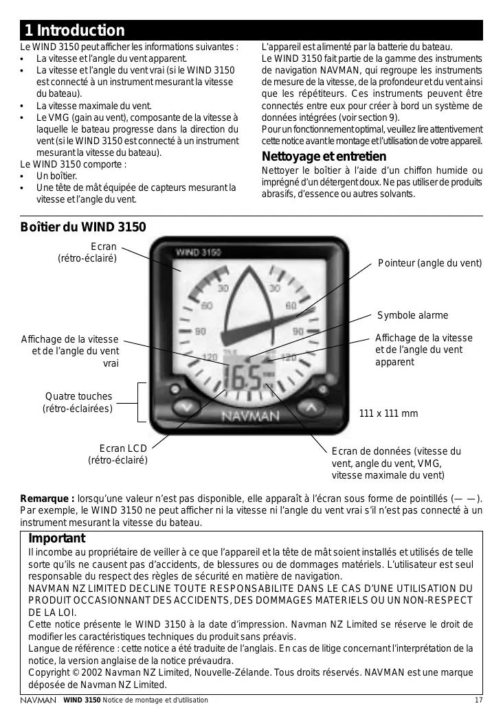Ecran Il incombe au propriétaire de veiller à ce que l’appareil et la tête de mât soient installés et utilisés de telle sorte qu’ils ne causent pas d’accidents, de blessures ou de dommages matériels. L’utilisateur est seul responsable du respect des règles de sécurité en matière de navigation. NAVMAN NZ LIMITED DECLINE TOUTE RESPONSABILITE DANS LE CAS D’UNE UTILISATION DU PRODUIT OCCASIONNANT DES ACCIDENTS, DES DOMMAGES MATERIELS OU UN NON-RESPECT DE LA LOI. Cette notice présente le WIND 3150 à la date d’impression. Navman NZ Limited se réserve le droit de modifier les caractéristiques techniques du produit sans préavis. Langue de référence : cette notice a été traduite de l’anglais. En cas de litige concernant l’interprétation de la notice, la version anglaise de la notice prévaudra. Copyright © 2002 Navman NZ Limited, Nouvelle-Zélande. Tous droits réservés. NAVMAN est une marque déposée de Navman NZ Limited. NAVMAN WIND 3150 Notice de montage et d'utilisation