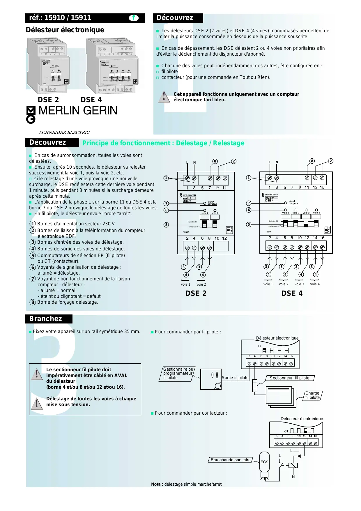 Cet appareil fonctionne uniquement avec un compteur électronique tarif bleu. Principe de fonctionnement : Délestage / Relestage # En cas de surconsommation, toutes les voies sont délestées. # Ensuite, après 10 secondes, le délesteur va relester successivement la voie 1, puis la voie 2, etc. 5 si le relestage d'une voie provoque une nouvelle surcharge, le DSE redélestera cette dernière voie pendant 1 minute, puis pendant 8 minutes si la surcharge demeure après cette minute. # L'application de la phase L sur la borne 11 du DSE 4 et la borne 7 du DSE 2 provoque le délestage de toutes les voies. # En fil pilote, le délesteur envoie l'ordre "arrêt". 1 Bornes d'alimentation secteur 230 V. 2 Bornes de liaison à la téléinformation du compteur électronique EDF. 3 Bornes d'entrée des voies de délestage. 4 Bornes de sortie des voies de délestage. 5 Commutateurs de sélection FP (fil pilote) ou CT (contacteur). 6 Voyants de signalisation de délestage : allumé = délestage. 7 Voyant de bon fonctionnement de la liaison compteur - délesteur : - allumé = normal - éteint ou clignotant = défaut. 8 Borne de forçage délestage.