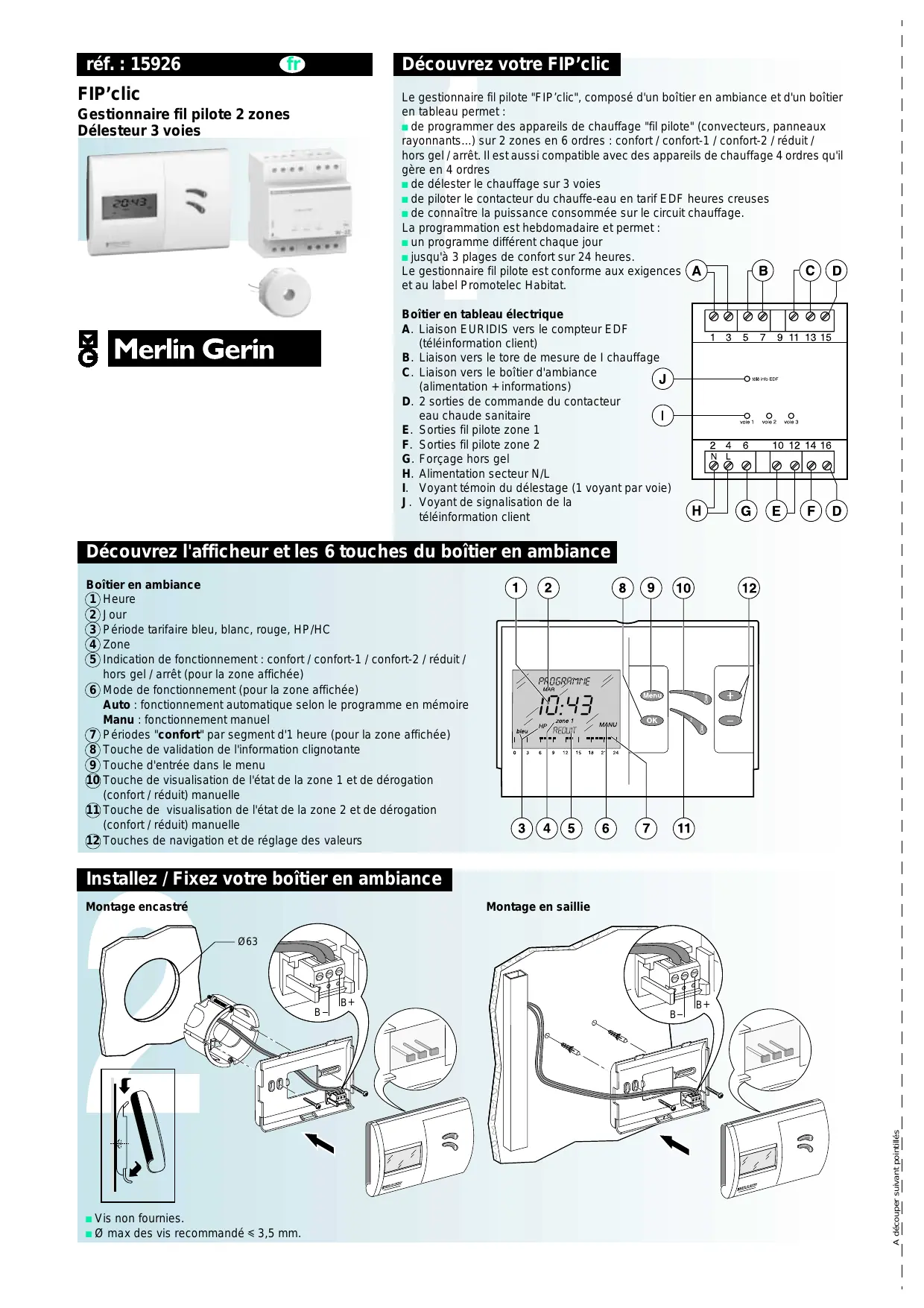 J. Voyant de signalisation de la téléinformation client Découvrez l'afficheur et les 6 touches du boîtier en ambiance Boîtier en ambiance 1 Heure 2 Jour 3 Période tarifaire bleu, blanc, rouge, HP/HC 4 Zone 5 Indication de fonctionnement : confort / confort-1 / confort-2 / réduit / hors gel / arrêt (pour la zone affichée) 6 Mode de fonctionnement (pour la zone affichée) Auto : fonctionnement automatique selon le programme en mémoire Manu : fonctionnement manuel 7 Périodes "confort" par segment d'1 heure (pour la zone affichée) 8 Touche de validation de l'information clignotante 9 Touche d'entrée dans le menu 10 Touche de visualisation de l'état de la zone 1 et de dérogation (confort / réduit) manuelle 11 Touche de visualisation de l'état de la zone 2 et de dérogation (confort / réduit) manuelle 12 Touches de navigation et de réglage des valeurs Installez / Fixez votre boîtier en ambiance Montage encastré Montage en saillie Ø63