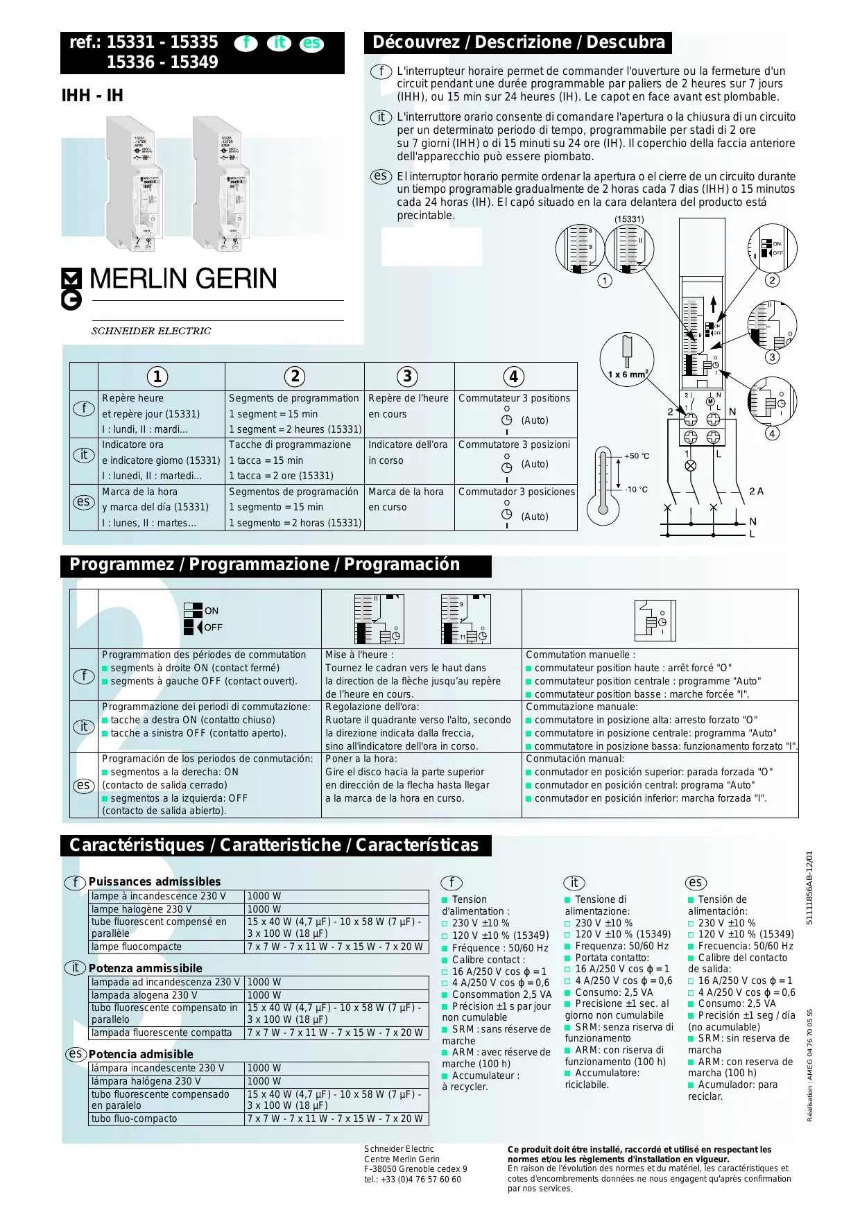 # Tension # Tensione di # Tensión de d'alimentation : 5 230 V ±10 % 5 120 V ±10 % (15349) # Fréquence : 50/60 Hz # Calibre contact : 5 16 A/250 V cos ϕ = 1 5 4 A/250 V cos ϕ = 0,6 # Consommation 2,5 VA # Précision ±1 s par jour non cumulable # SRM : sans réserve de marche # ARM : avec réserve de marche (100 h) # Accumulateur : à recycler. alimentazione: 5 230 V ±10 % 5 120 V ±10 % (15349) # Frequenza: 50/60 Hz # Portata contatto: 5 16 A/250 V cos ϕ = 1 5 4 A/250 V cos ϕ = 0,6 # Consumo: 2,5 VA # Precisione ±1 sec. al giorno non cumulabile # SRM: senza riserva di funzionamento # ARM: con riserva di funzionamento (100 h) # Accumulatore: riciclabile. alimentación: 5 230 V ±10 % 5 120 V ±10 % (15349) # Frecuencia: 50/60 Hz # Calibre del contacto de salida: 5 16 A/250 V cos ϕ = 1 5 4 A/250 V cos ϕ = 0,6 # Consumo: 2,5 VA # Precisión ±1 seg / día (no acumulable) # SRM: sin reserva de marcha # ARM: con reserva de marcha (100 h) # Acumulador: para reciclar. Schneider Electric Centre Merlin Gerin F-38050 Grenoble cedex 9 tel.: +33 (0)4 76 57 60 60 Ce produit doit être installé, raccordé et utilisé en respectant les normes et/ou les règlements d'installation en vigueur. En raison de l'évolution des normes et du matériel, les caractéristiques et cotes d'encombrements données ne nous engagent qu'après confirmation par nos services. 51111856AB-12/01