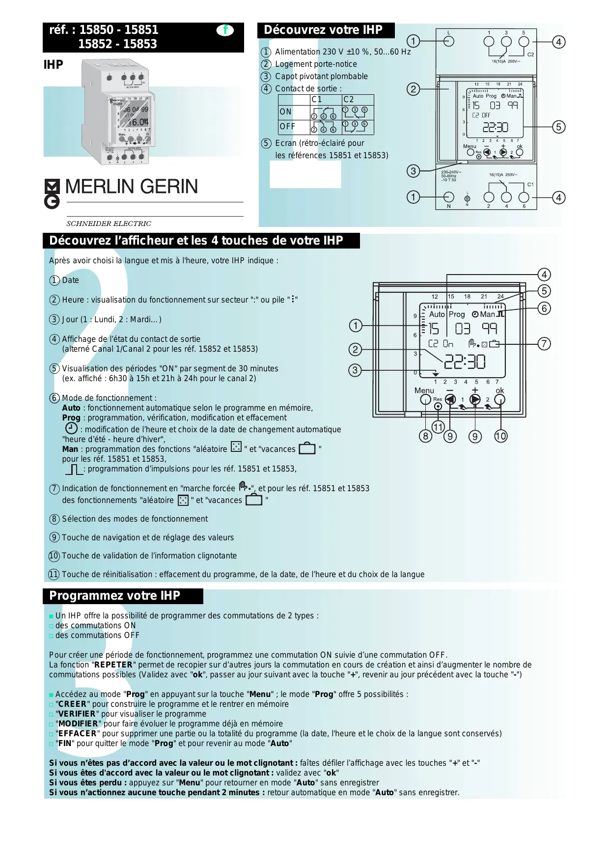2 Heure : visualisation du fonctionnement sur secteur ":" ou pile " " 3 Jour (1 : Lundi, 2 : Mardi…) 4 Affichage de l’état du contact de sortie (alterné Canal 1/Canal 2 pour les réf. 15852 et 15853) 5 Visualisation des périodes "ON" par segment de 30 minutes (ex. affiché : 6h30 à 15h et 21h à 24h pour le canal 2) 6 Mode de fonctionnement : Auto : fonctionnement automatique selon le programme en mémoire, Prog : programmation, vérification, modification et effacement : modification de l’heure et choix de la date de changement automatique "heure d’été - heure d’hiver", Man : programmation des fonctions "aléatoire " et "vacances pour les réf. 15851 et 15853, : programmation d’impulsions pour les réf. 15851 et 15853, 7 Indication de fonctionnement en "marche forcée ", et pour les réf. 15851 et 15853 des fonctionnements "aléatoire " et "vacances 8 Sélection des modes de fonctionnement 9 Touche de navigation et de réglage des valeurs 10 Touche de validation de l’information clignotante 11 Touche de réinitialisation : effacement du programme, de la date, de l’heure et du choix de la langue Programmez votre IHP