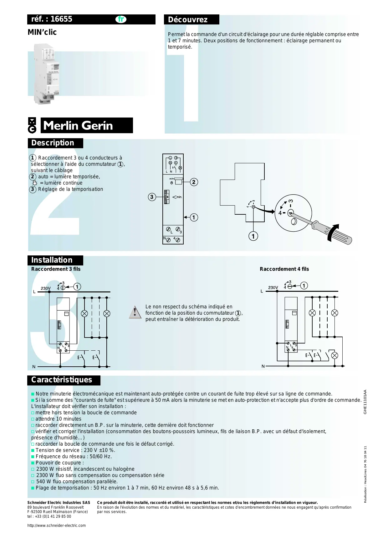 Le non respect du schéma indiqué en fonction de la position du commutateur 1 , peut entraîner la détérioration du produit. Schneider Electric Industries SAS 89 boulevard Franklin Roosevelt F-92500 Rueil Malmaison (France) tel : +33 (0)1 41 29 85 00 http://www.schneider-electric.com Ce produit doit être installé, raccordé et utilisé en respectant les normes et/ou les règlements d’installation en vigueur. En raison de l’évolution des normes et du matériel, les caractéristiques et cotes d’encombrement données ne nous engagent qu’après confirmation par nos services. Réalisation : HeadLines 04 76 18 04 11 b Notre minuterie électromécanique est maintenant auto-protégée contre un courant de fuite trop élevé sur sa ligne de commande. b Si la somme des "courants de fuite" est supérieure à 50 mA alors la minuterie se met en auto-protection et n'accepte plus d'ordre de commande. L'installateur doit vérifier son installation : v mettre hors tension la boucle de commande v attendre 10 minutes v raccorder directement un B.P. sur la minuterie, cette dernière doit fonctionner v vérifier et corriger l'installation (consommation des boutons-poussoirs lumineux, fils de liaison B.P. avec un défaut d'isolement, présence d'humidité…) v raccorder la boucle de commande une fois le défaut corrigé. b Tension de service : 230 V ±10 %. b Fréquence du réseau : 50/60 Hz. b Pouvoir de coupure : v 2300 W résistif, incandescent ou halogène v 2300 W fluo sans compensation ou compensation série v 540 W fluo compensation parallèle. b Plage de temporisation : 50 Hz environ 1 à 7 min, 60 Hz environ 48 s à 5,6 min. GHE11101AA Caractéristiques