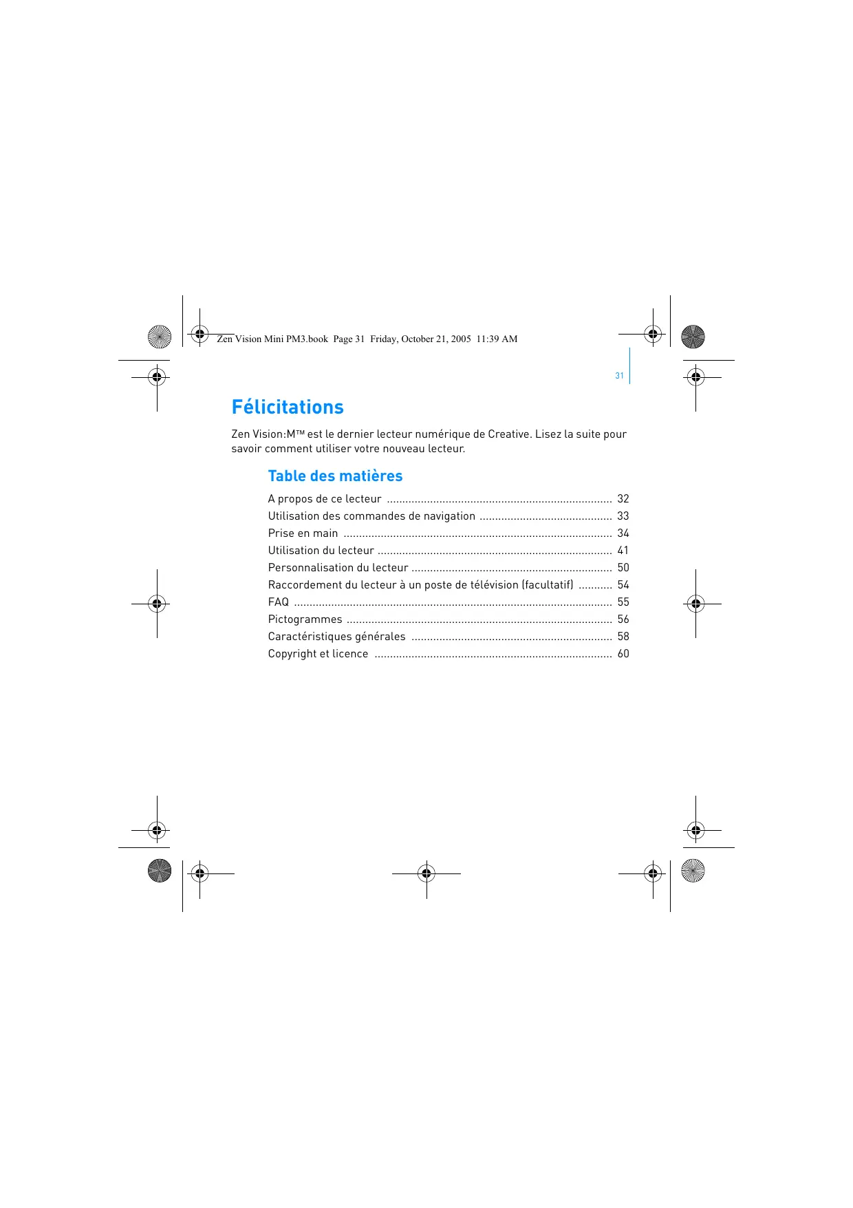 Félicitations Zen Vision:M™ est le dernier lecteur numérique de Creative. Lisez la suite pour savoir comment utiliser votre nouveau lecteur.