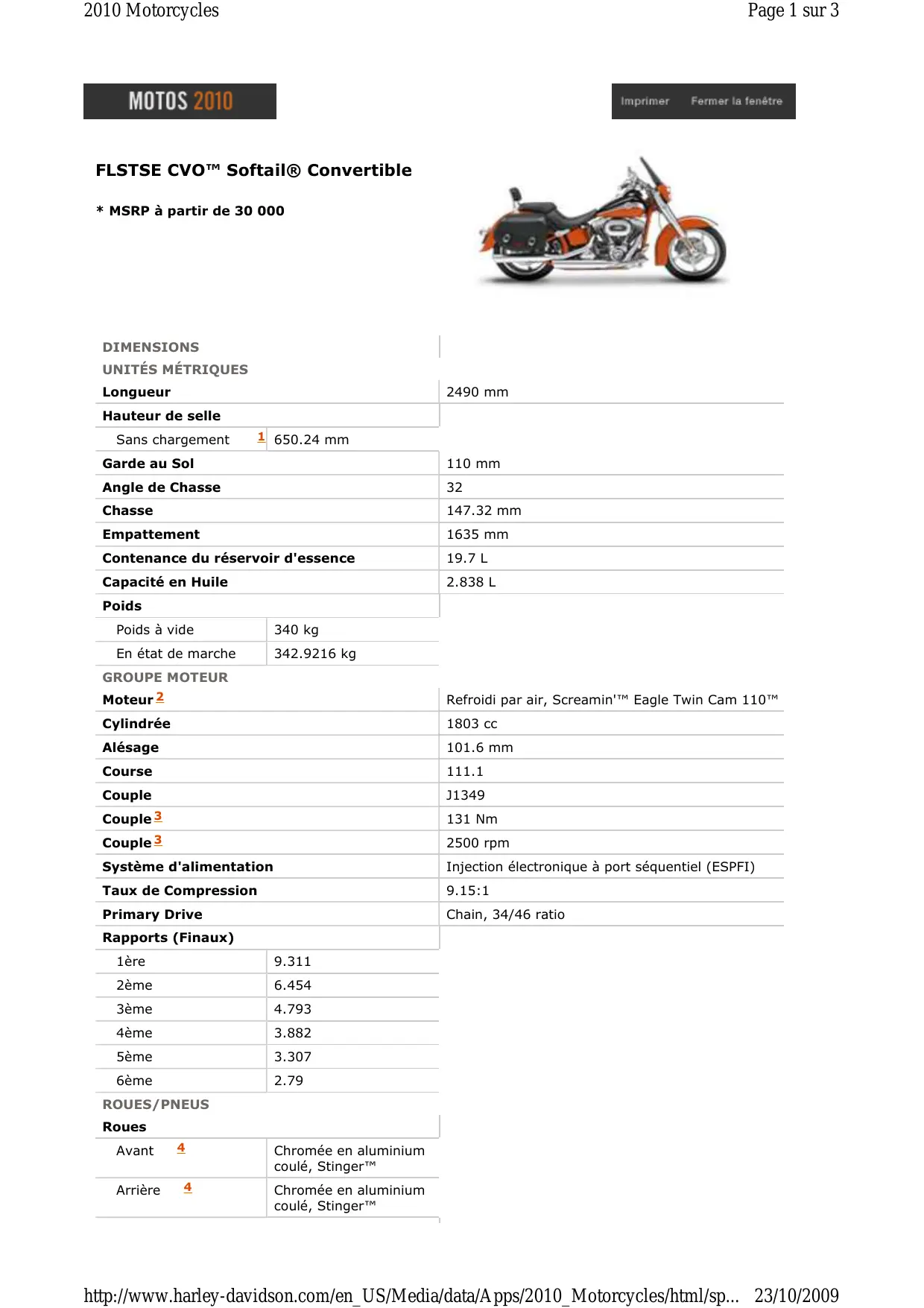 Poids Poids à vide 340 kg En état de marche 342.9216 kg GROUPE MOTEUR Moteur 2 Refroidi par air, Screamin'™ Eagle Twin Cam 110™ Cylindrée 1803 cc Alésage